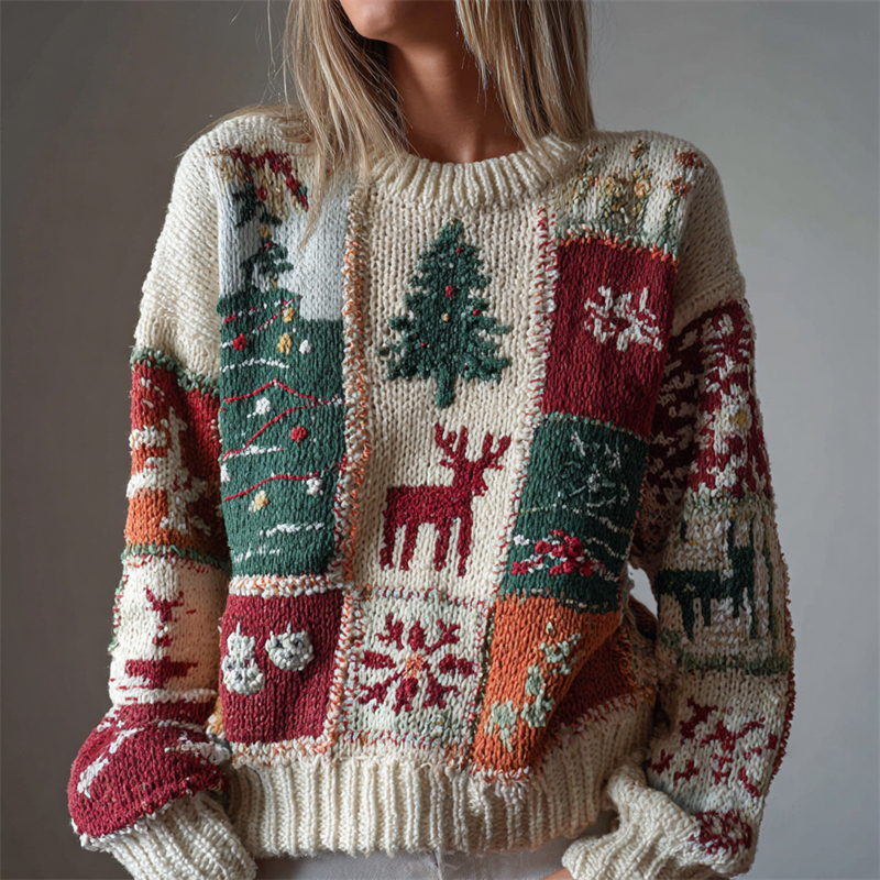 Vintage Christmas Elements Colorblock Patchwork Cozy Knit Sweater$34.99 USD -