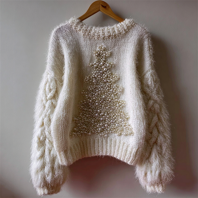 Vintage Christmas Trees Pearls Beaded Cozy Fuzzy Sweater$34.99 USD -