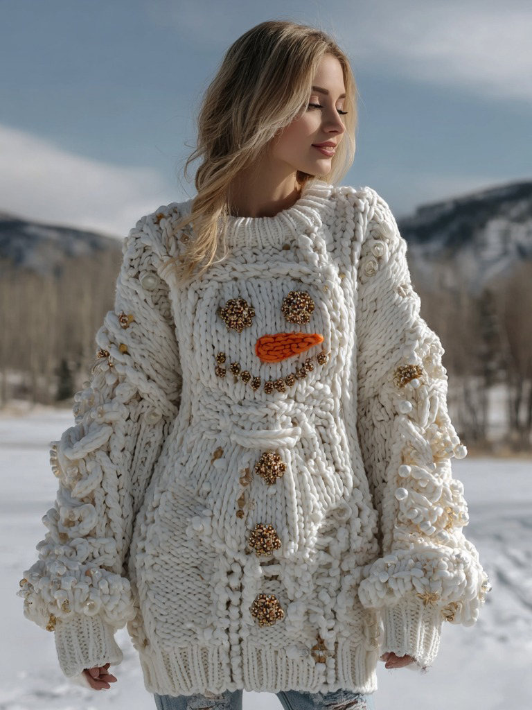 Women's Cute Christmas Snowman Face Knitted Jacquard Crew Neck Sweater$34.99 USD -