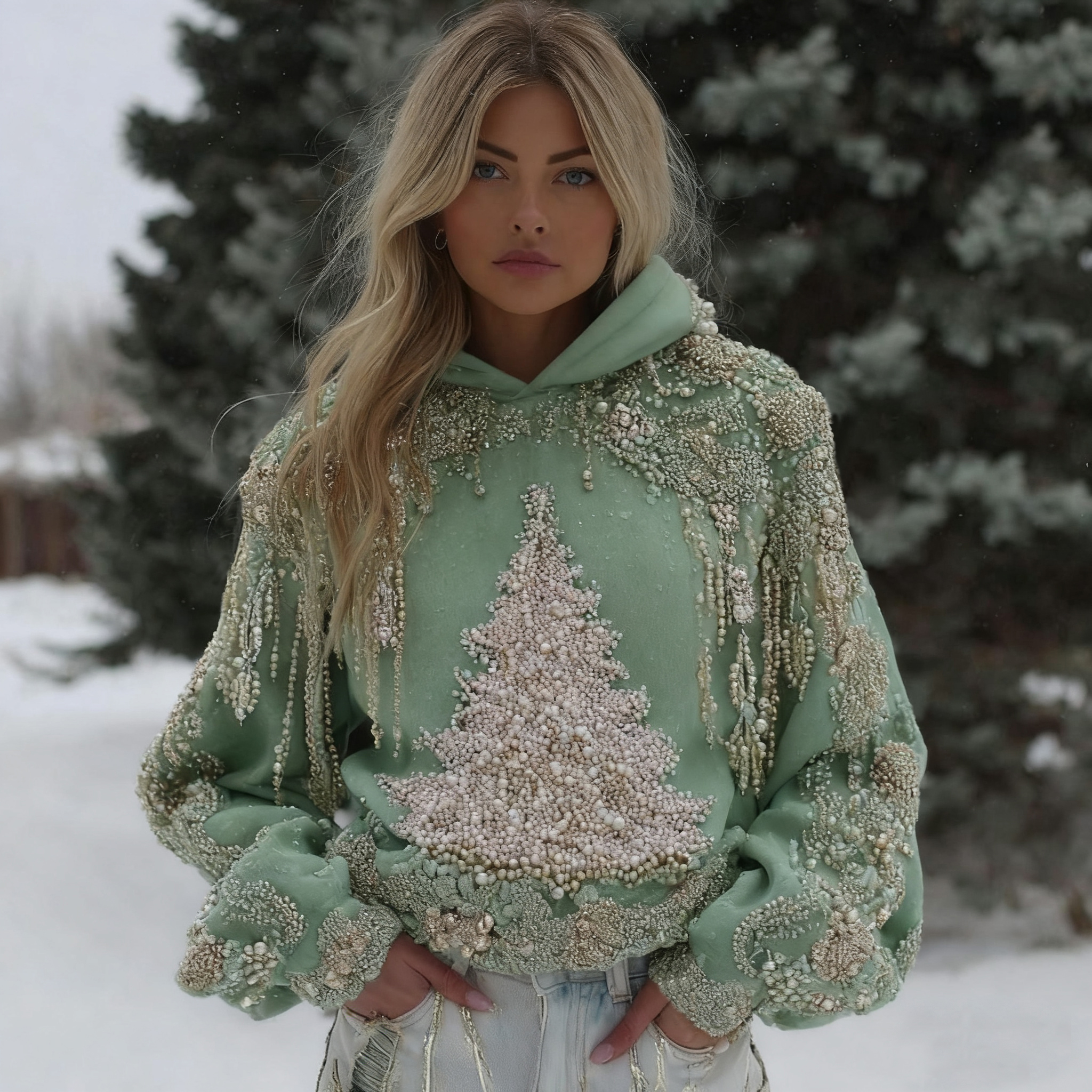 Women's Pearl & Rose Christmas Tree Art Hooded Sweater$36.99 USD -