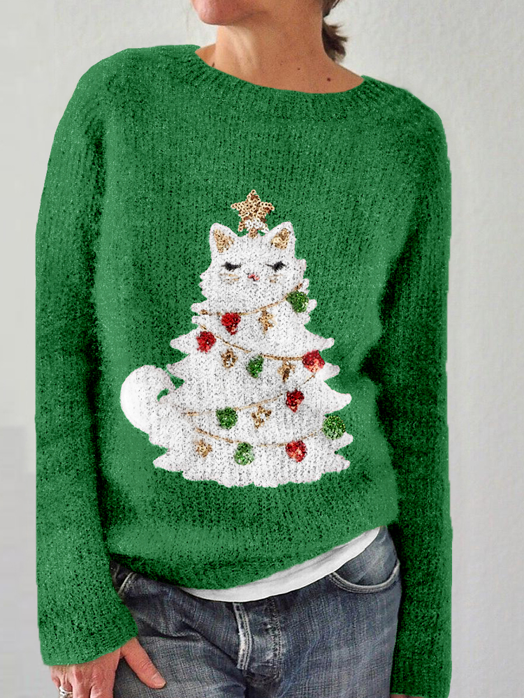 Christmas Tree Cute Cat 3D Print Knit Pullover Sweater$31.99 USD -