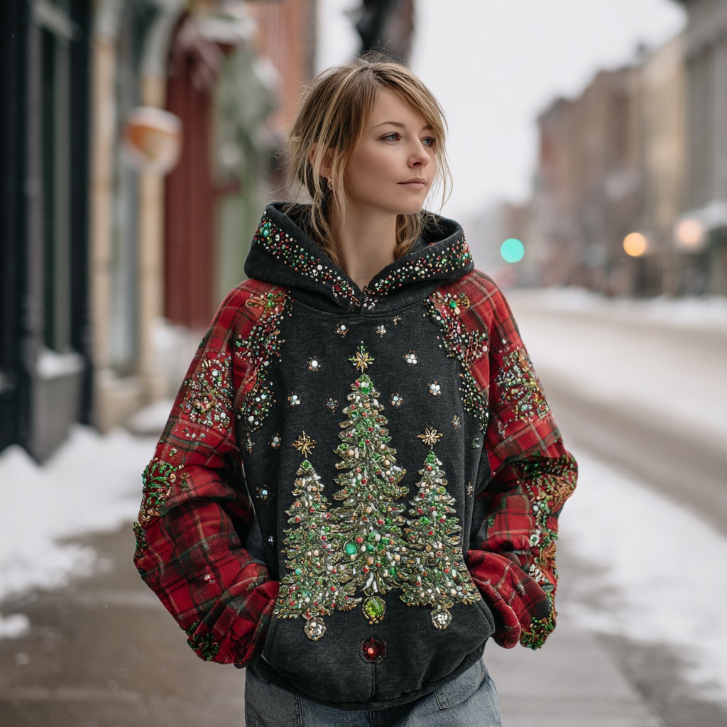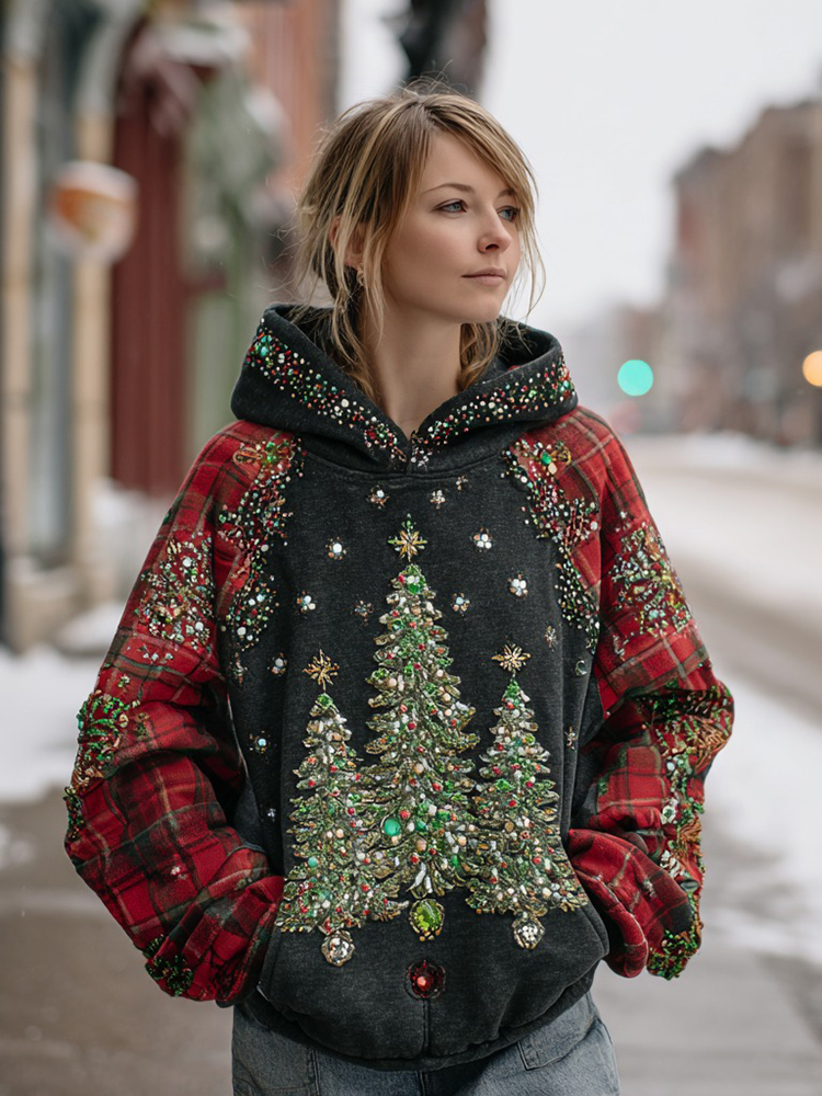Women's Retro Plaid Christmas Tree Pattern Casual Hooded Sweatshirt$36.99 USD -