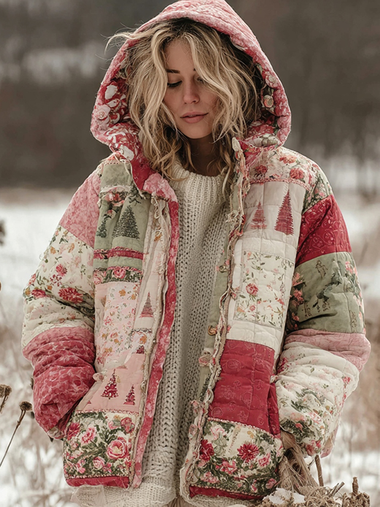 Women's Floral Christmas Tree Patchwork Warm Zip Hoodie$73.99 USD -