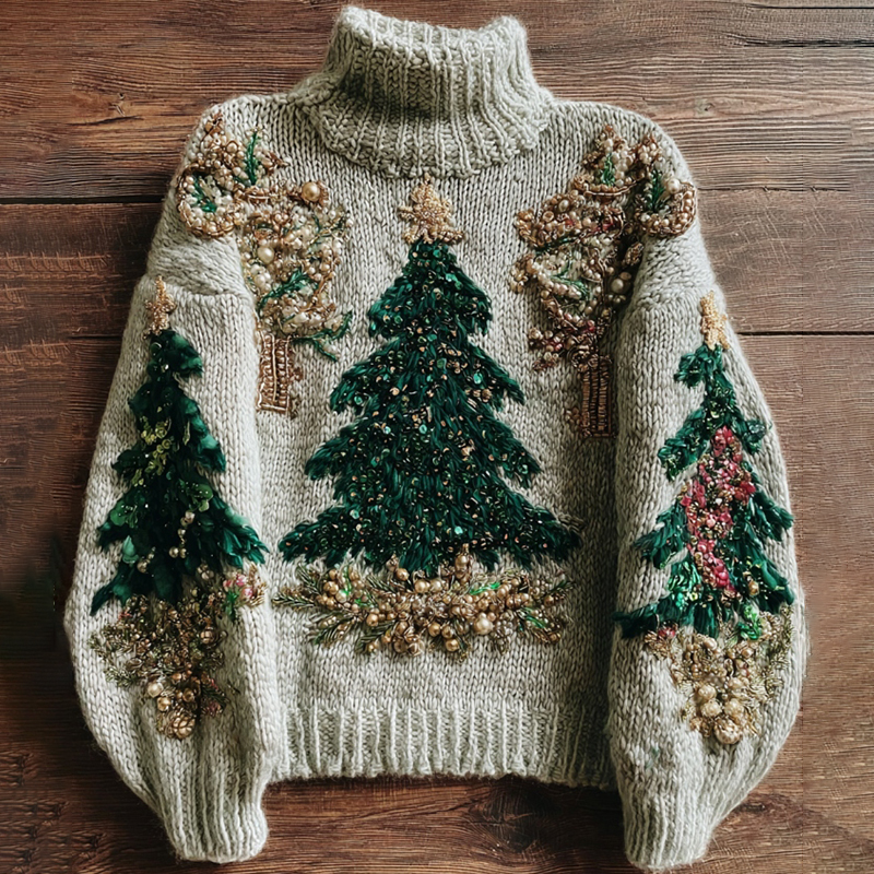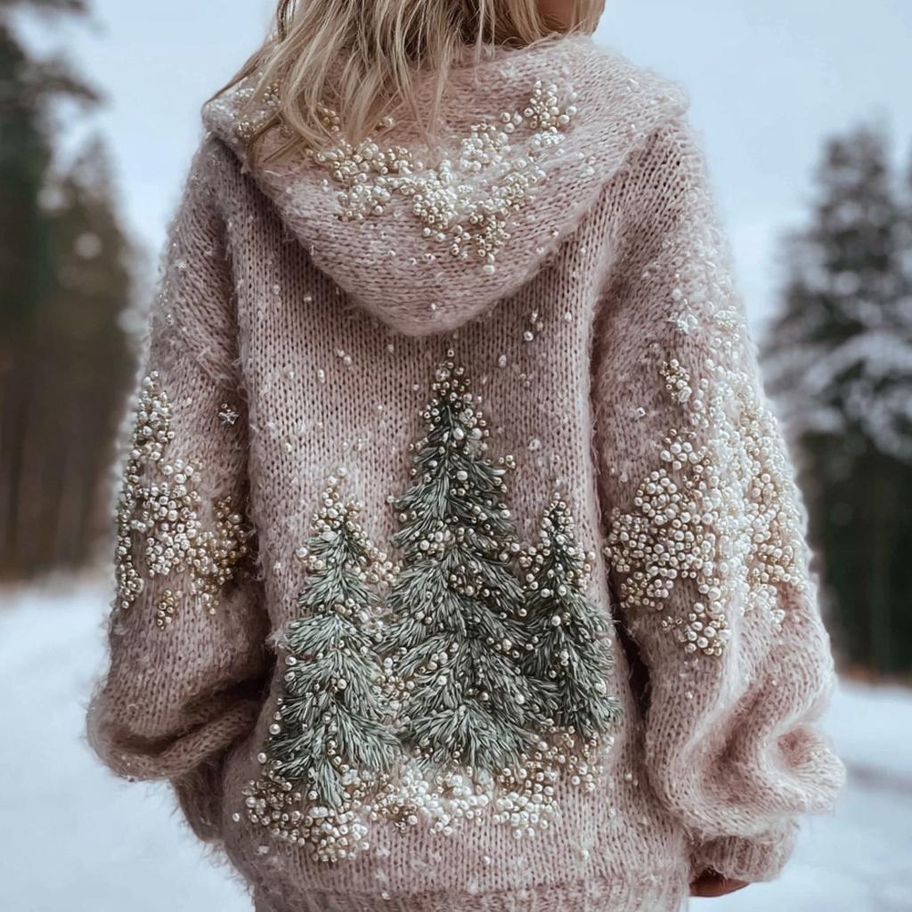 Women's Chunky Knit Pearl Christmas Tree Gradient Warm Hooded Sweater$36.99 USD -