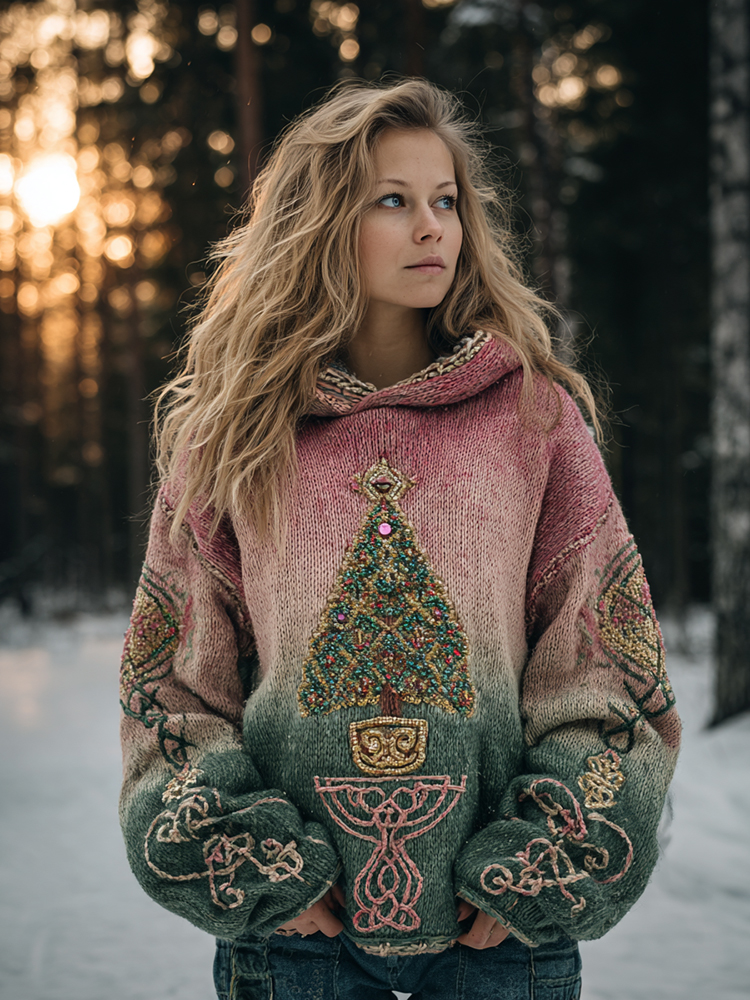 Women's Christmas Tree Knot Gradient Warm Hooded Sweater$36.99 USD -
