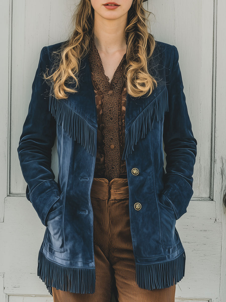 Western Retro Dark Blue Velvet Fringed Suit Jacket$98.60 USD -
