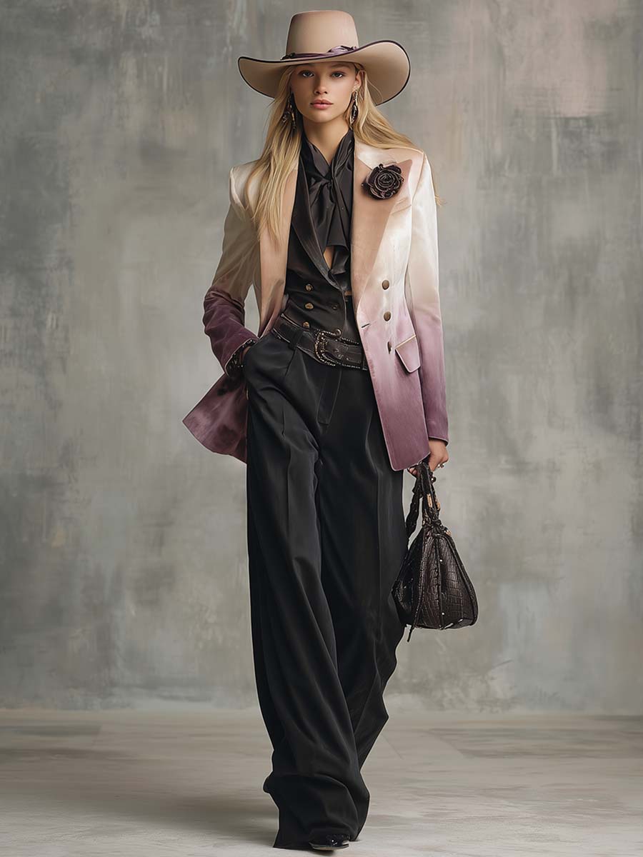 Elegant Retro Western Peak Lapel 3D Flower Decoration Beige And Purple Gradient Velvet Blazer$109.17 USD -