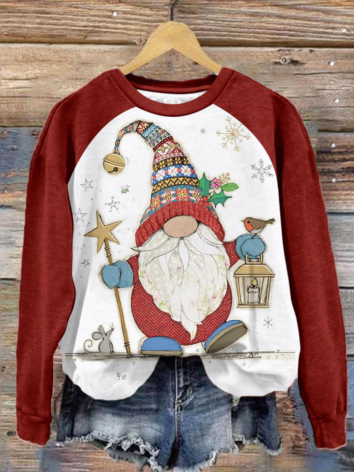 Christmas Gnome Print Raglan Long Sleeve Top$28.34 USD -