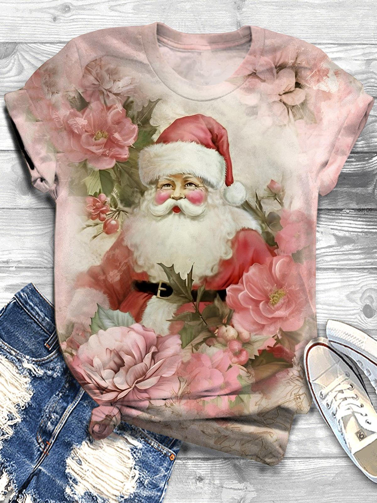 Floral Santa Print Crew Neck T-shirt$20.99 USD -