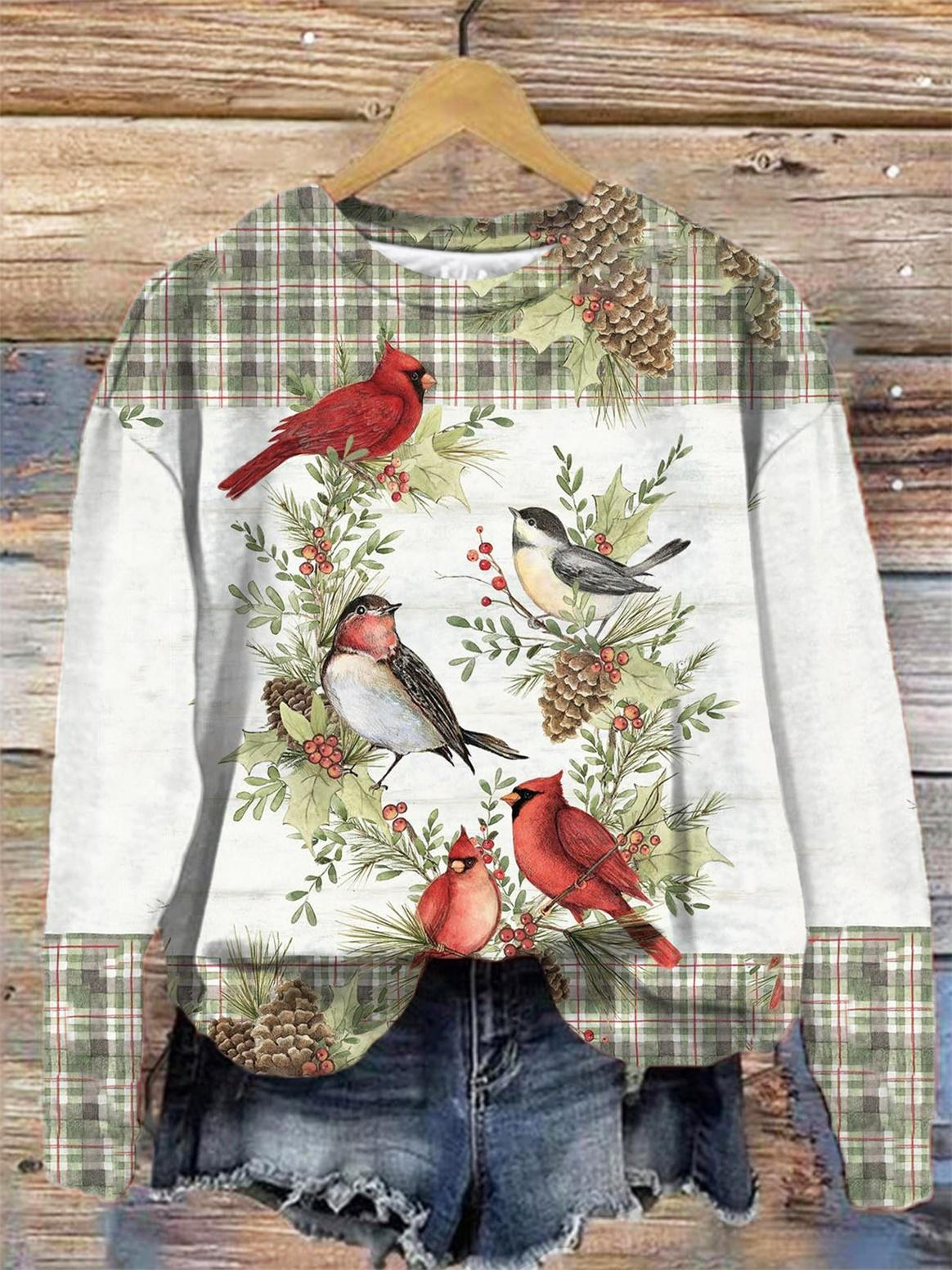 Retro Plaid Bird Print Round Neck Top$28.34 USD -