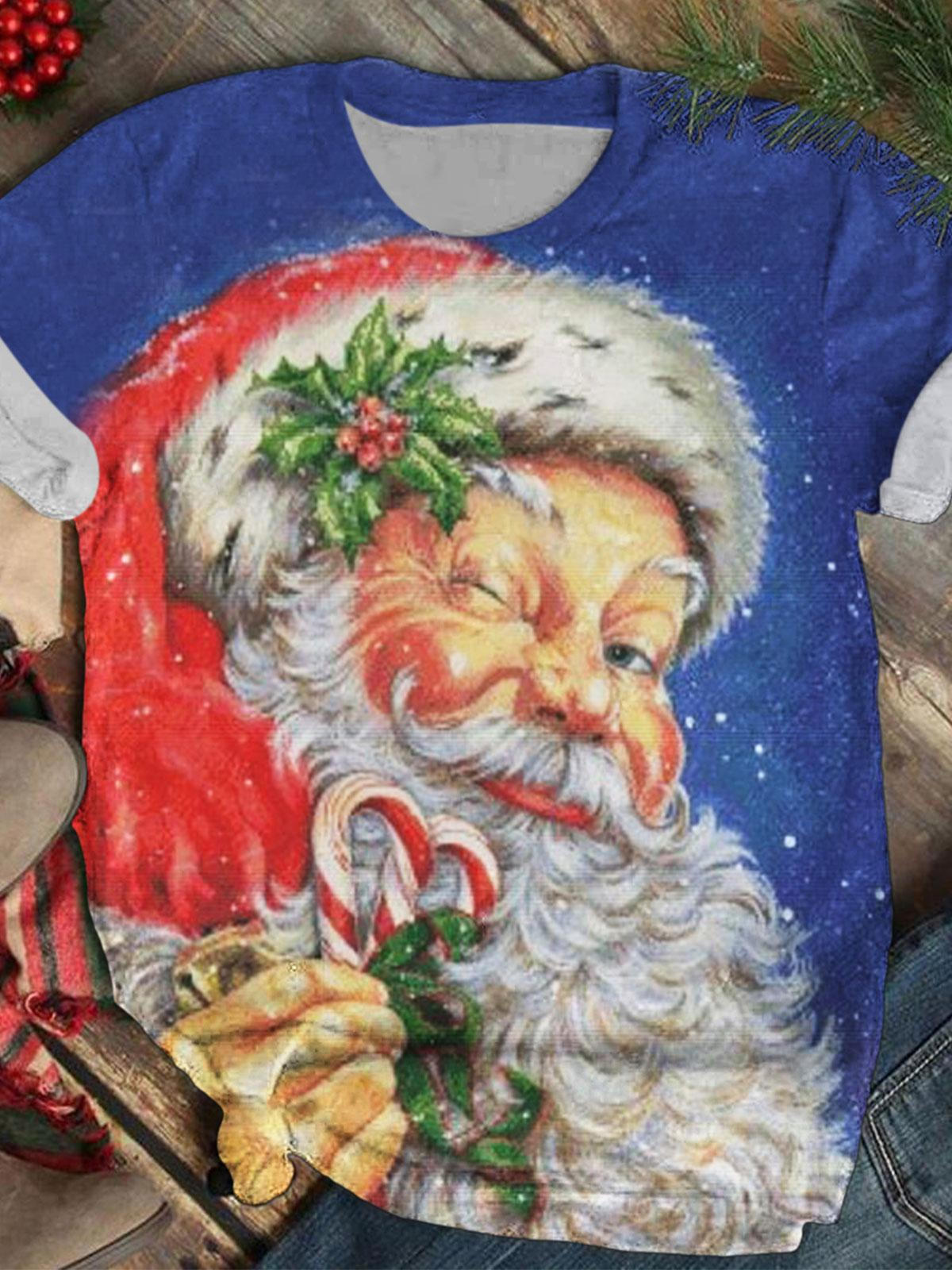 Women's Santa Printed Round Neck Short Sleeve T-Shirt$20.99 USD -