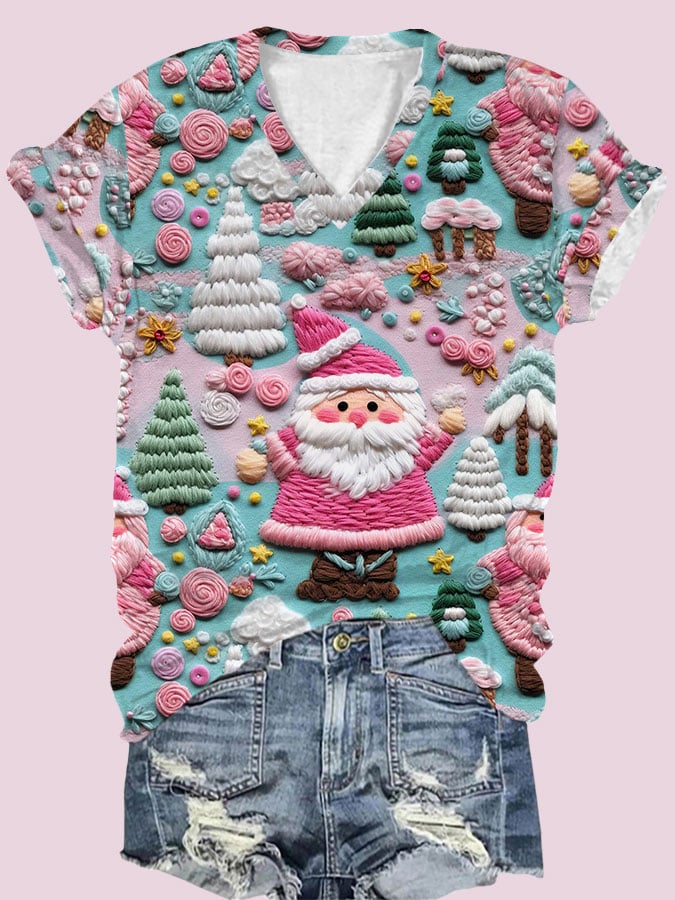 Women's Pink Santa Claus Print V-Neck T-Shirt$19.99 USD