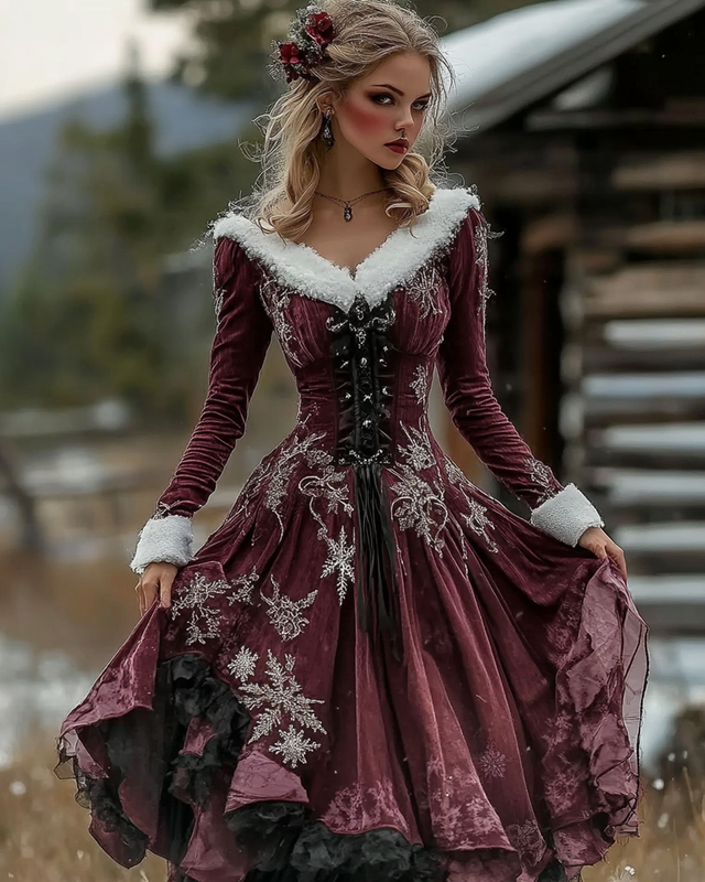 Women's Christmas themed snowflake embroidered fur collar patchwork dress 6298$39.89 USD -