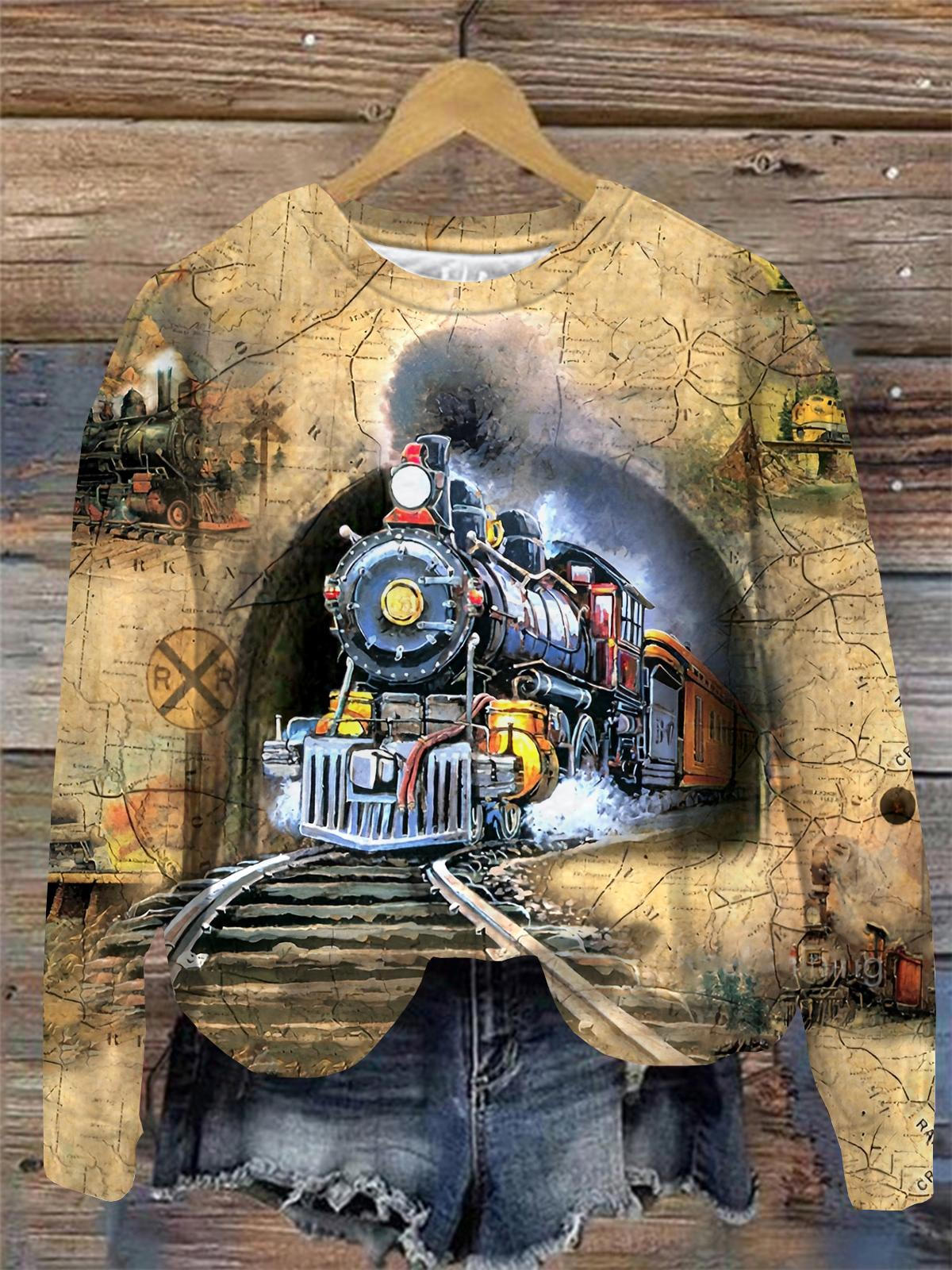 Vintage Train Print Round Neck Long Sleeve Top$28.34 USD -