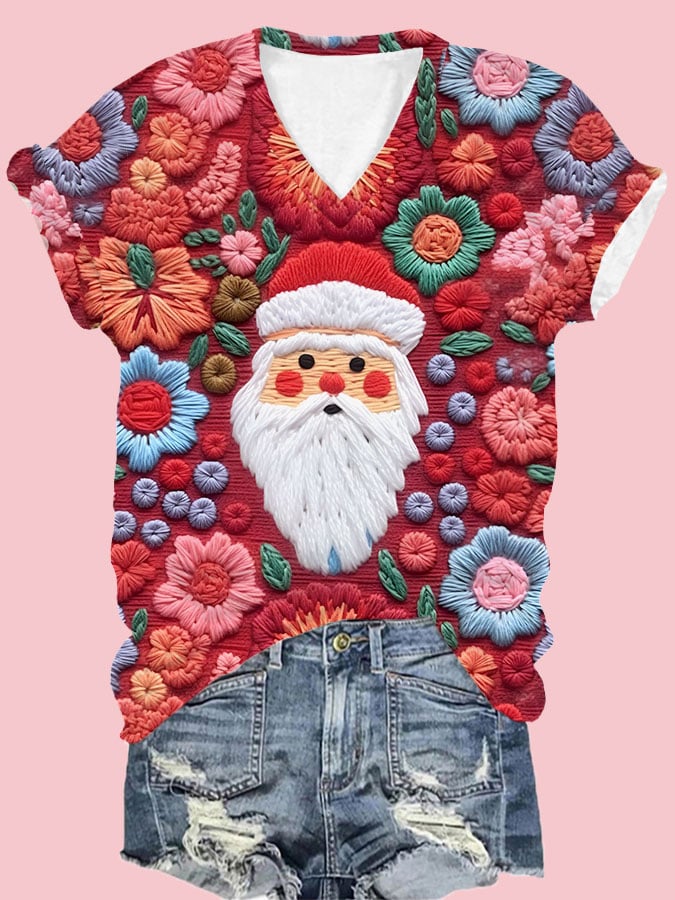 Women's Santa Print V-Neck T-Shirt$23.09 USD -