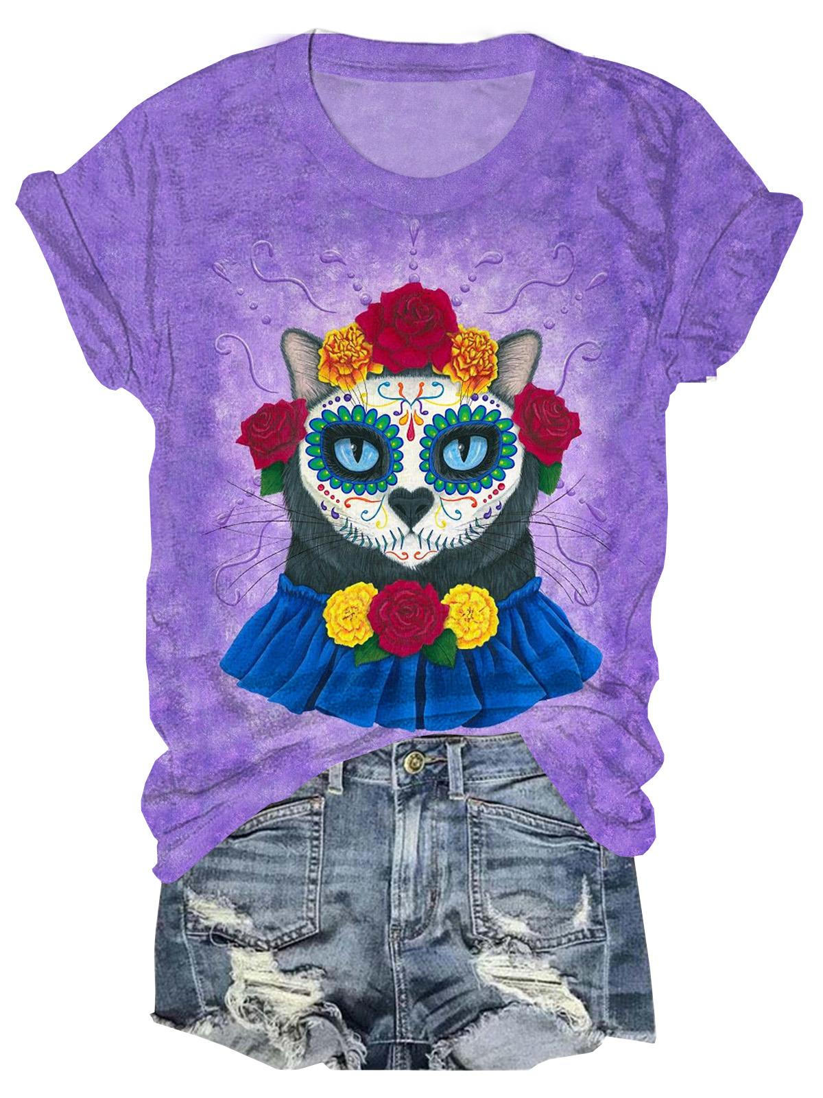 Cat Print Crew Neck T-shirt$20.99 USD -