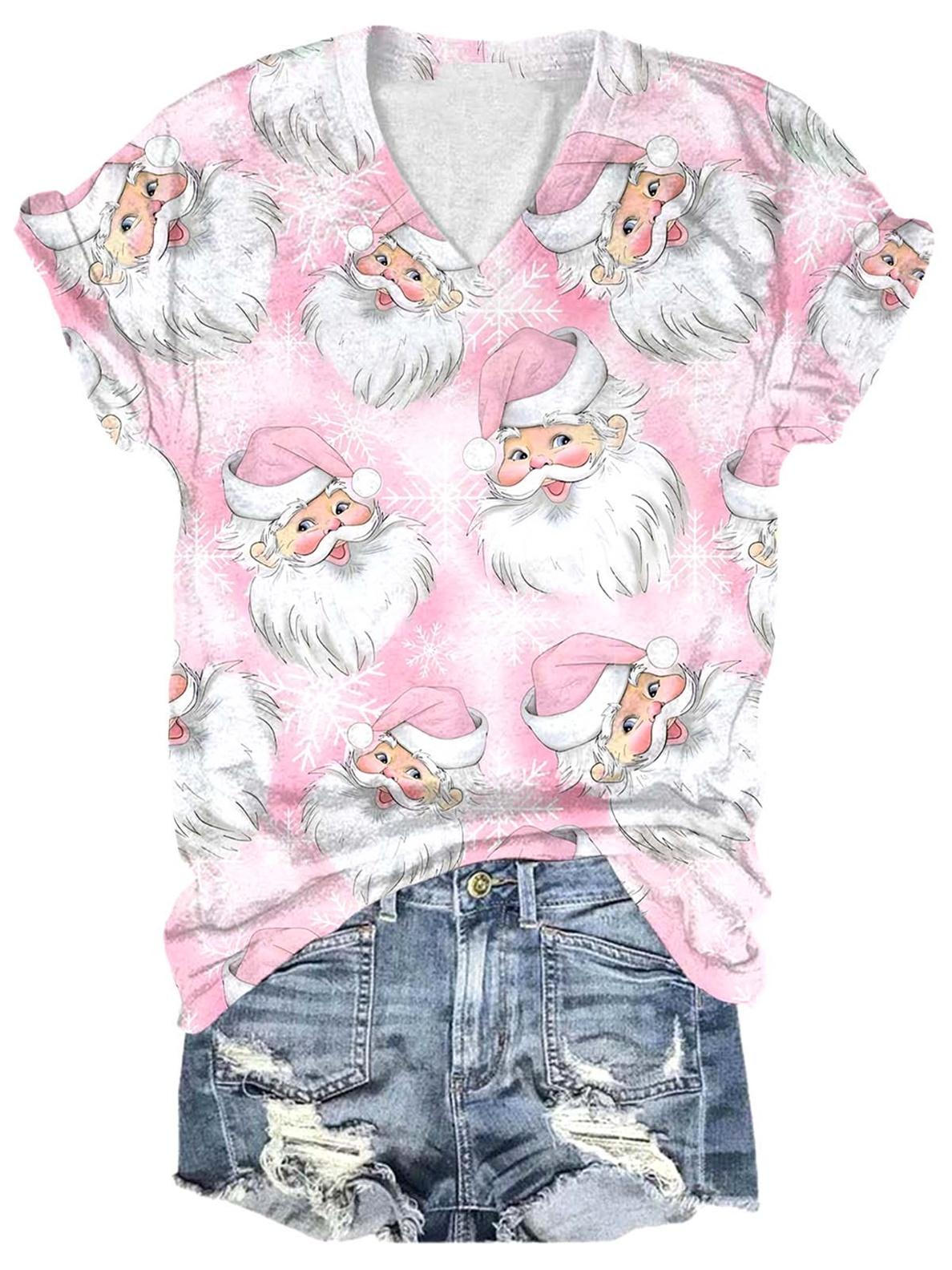Women's Pink Santa Print V-Neck T-Shirt$25.19 USD -