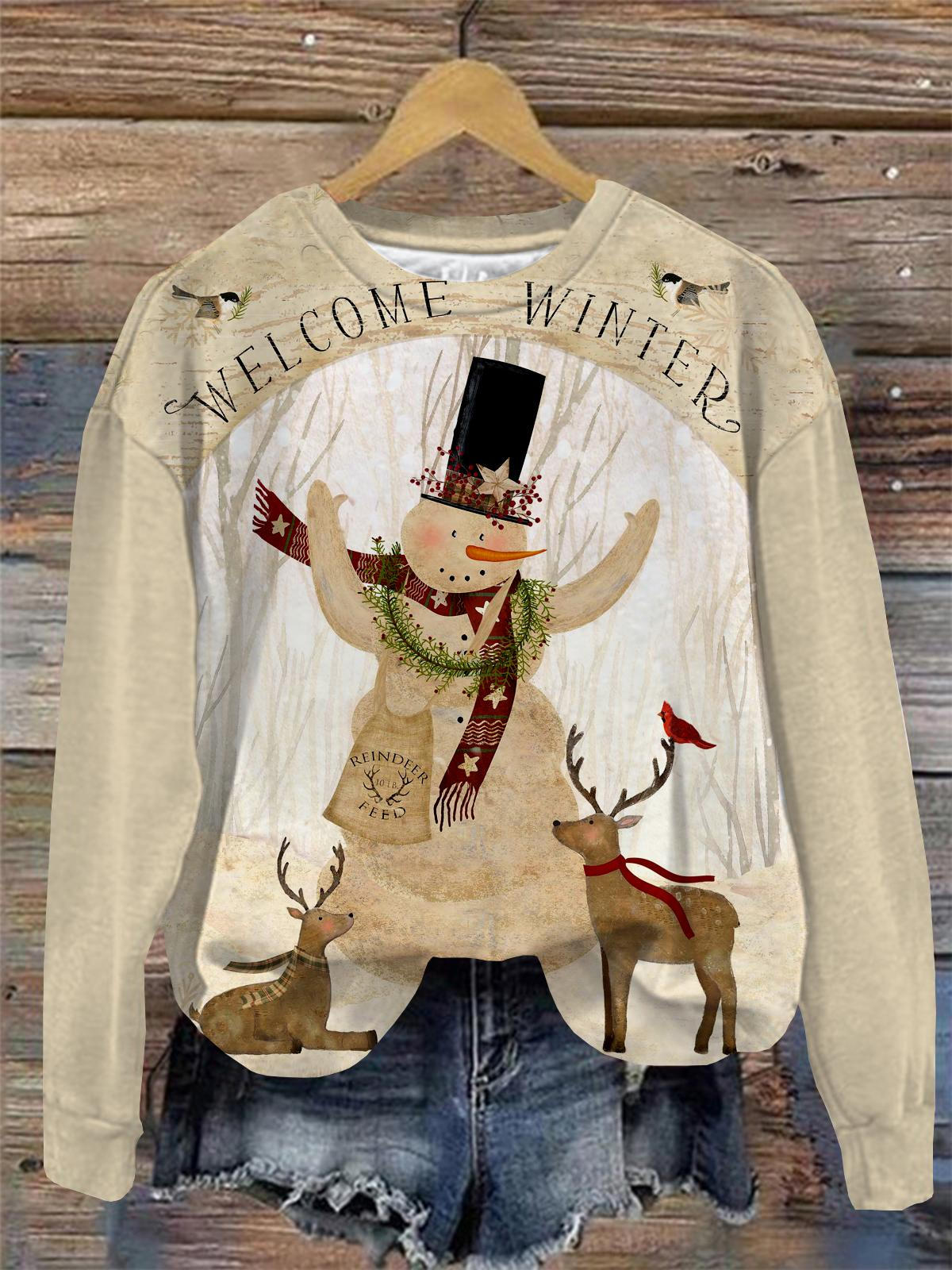 Snowman Deer Print Round Neck Long Sleeve Top$28.34 USD -