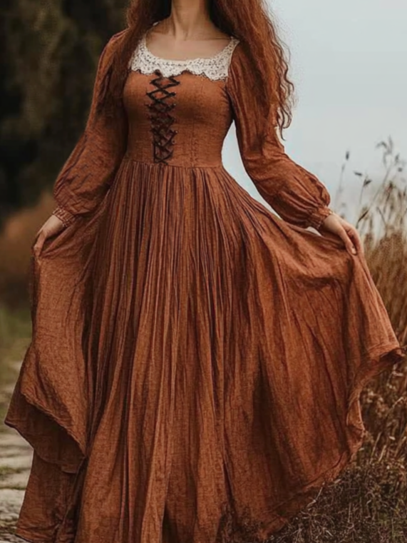 Vintage Lace Patchwork Pleated Linen Maxi Dress$65.44 USD -
