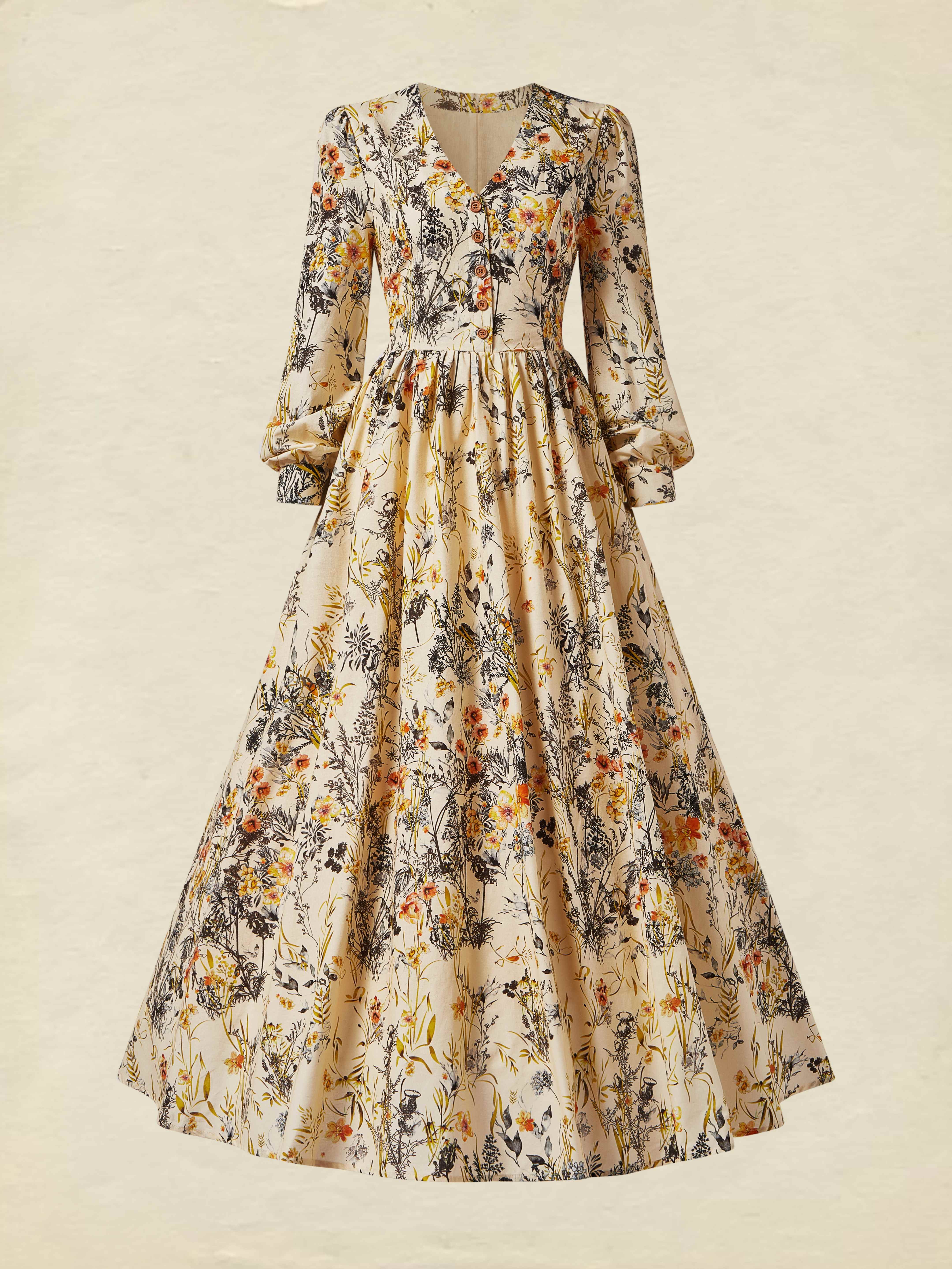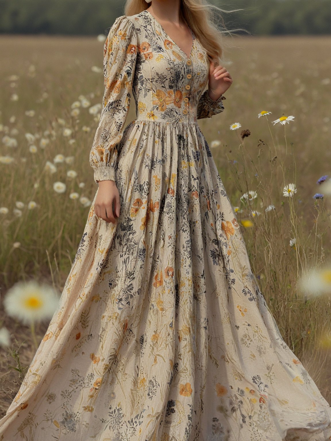 Linen Maxi Dress, Long Sleeves, V Neck, Floral, Apricot,Daily$68.25 USD -