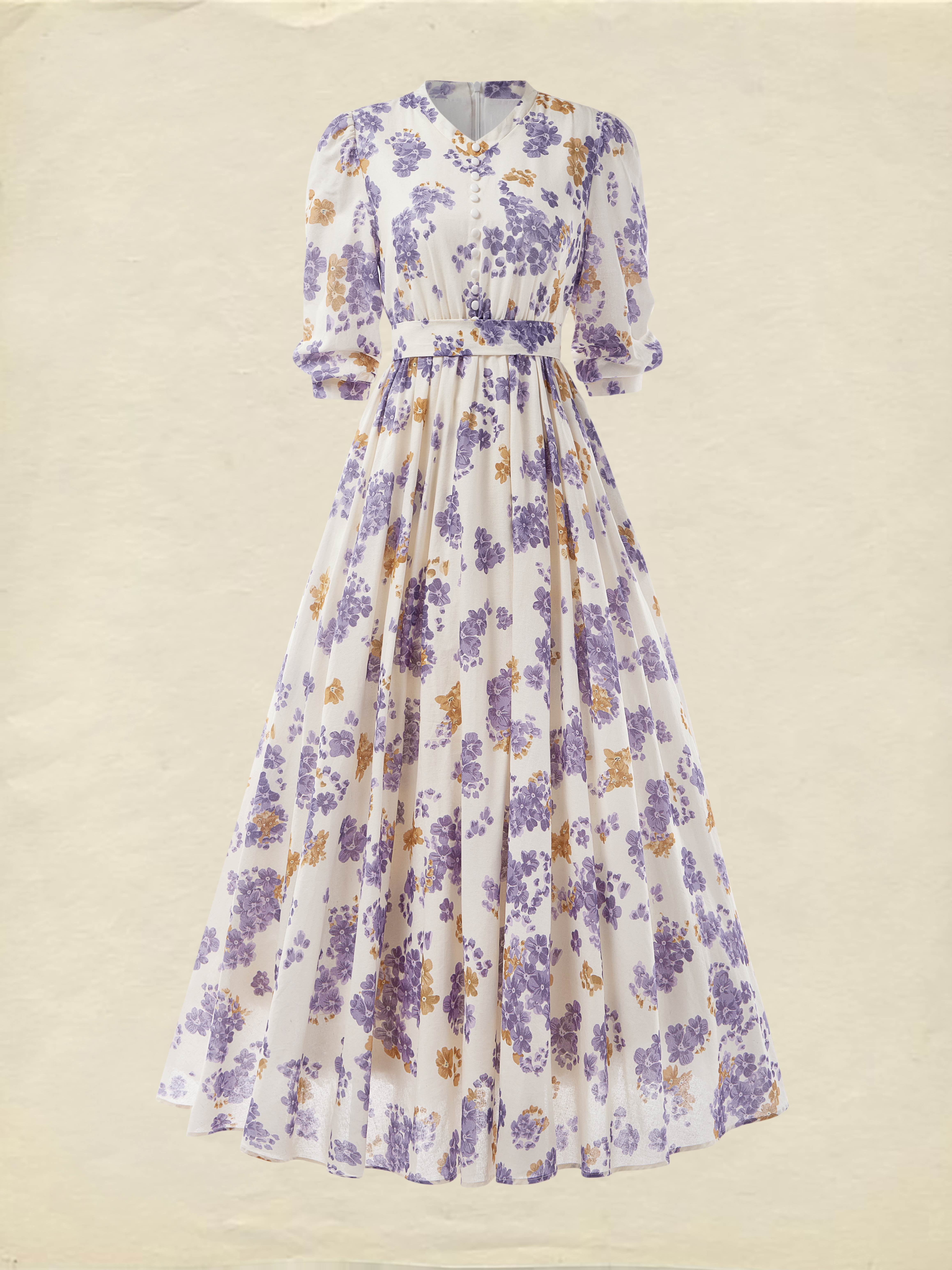 Maxi Linen Dress, Casual, Floral, Pocket Stitching, Crew Neck, Belt, Half Sleeve, Purple, Vintage$68.25 USD