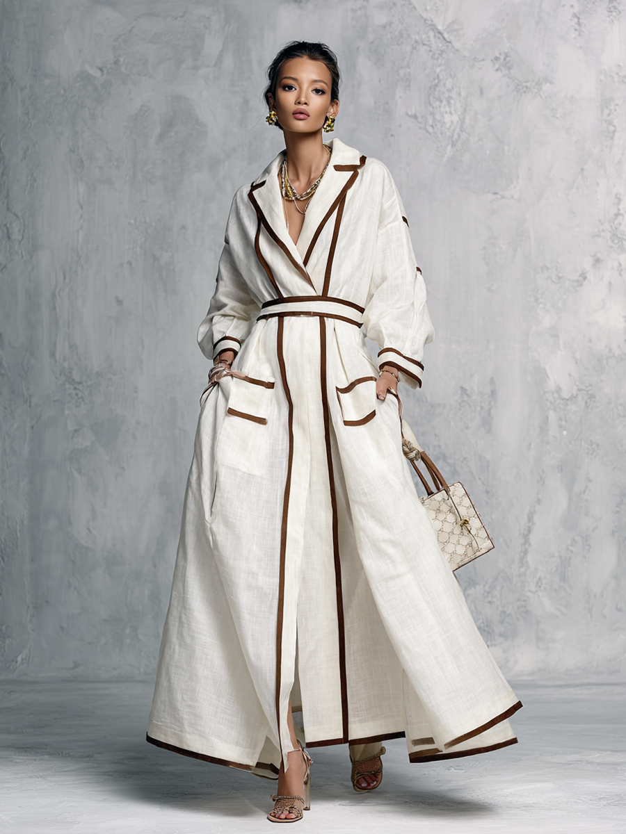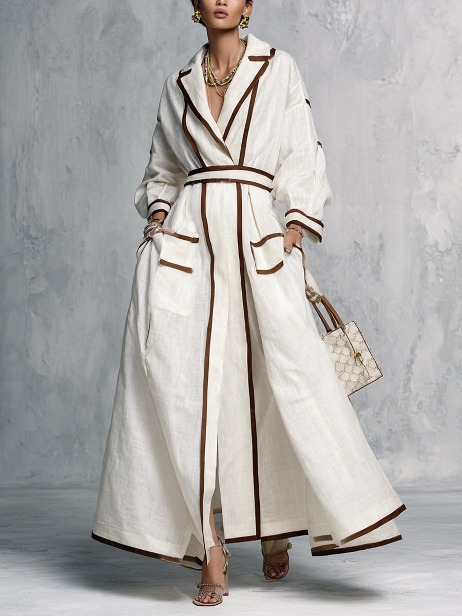Women's Retro Style Off-White Color Block Striped Patchwork Long Trench Coat Dress MDZ1275B5BA$68.25 USD -