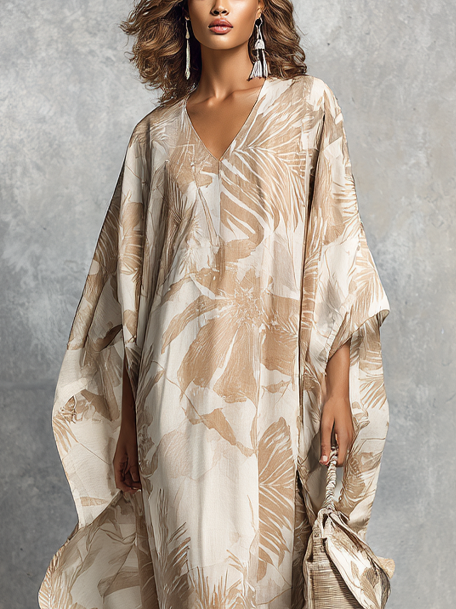 Women's Vacation Style Beige Printed V-neck Loose Long Dress MDZ0931B1BA$68.25 USD -