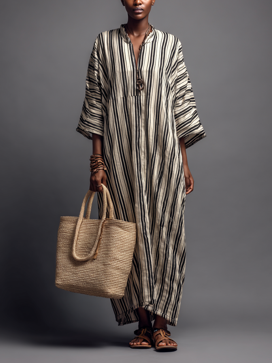 Women's Retro-style Beige And Black Striped Cotton-linen Loose-fitting Long Dress MDZ1284B2BA$68.25 USD -
