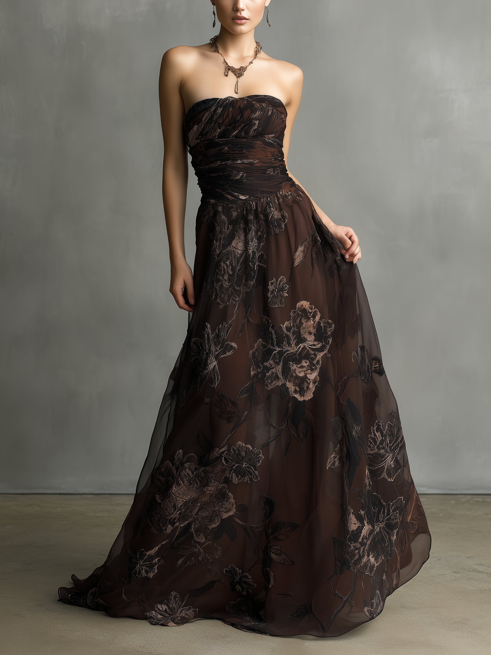 Women's Elegant Brown Printed Chiffon Strapless Sleeveless Long Dress MDZ1305B0AN$68.25 USD -