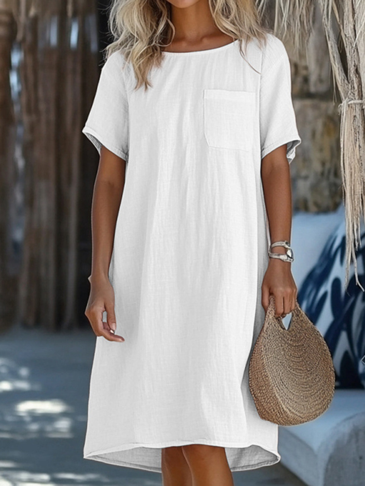 Fashionable And Casual Cotton And Linen Round Neck Short Sleeve Dress$30.85 USD -