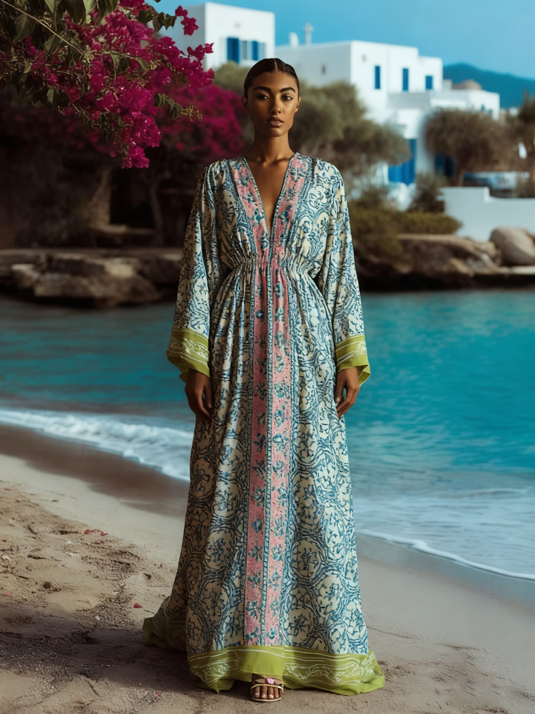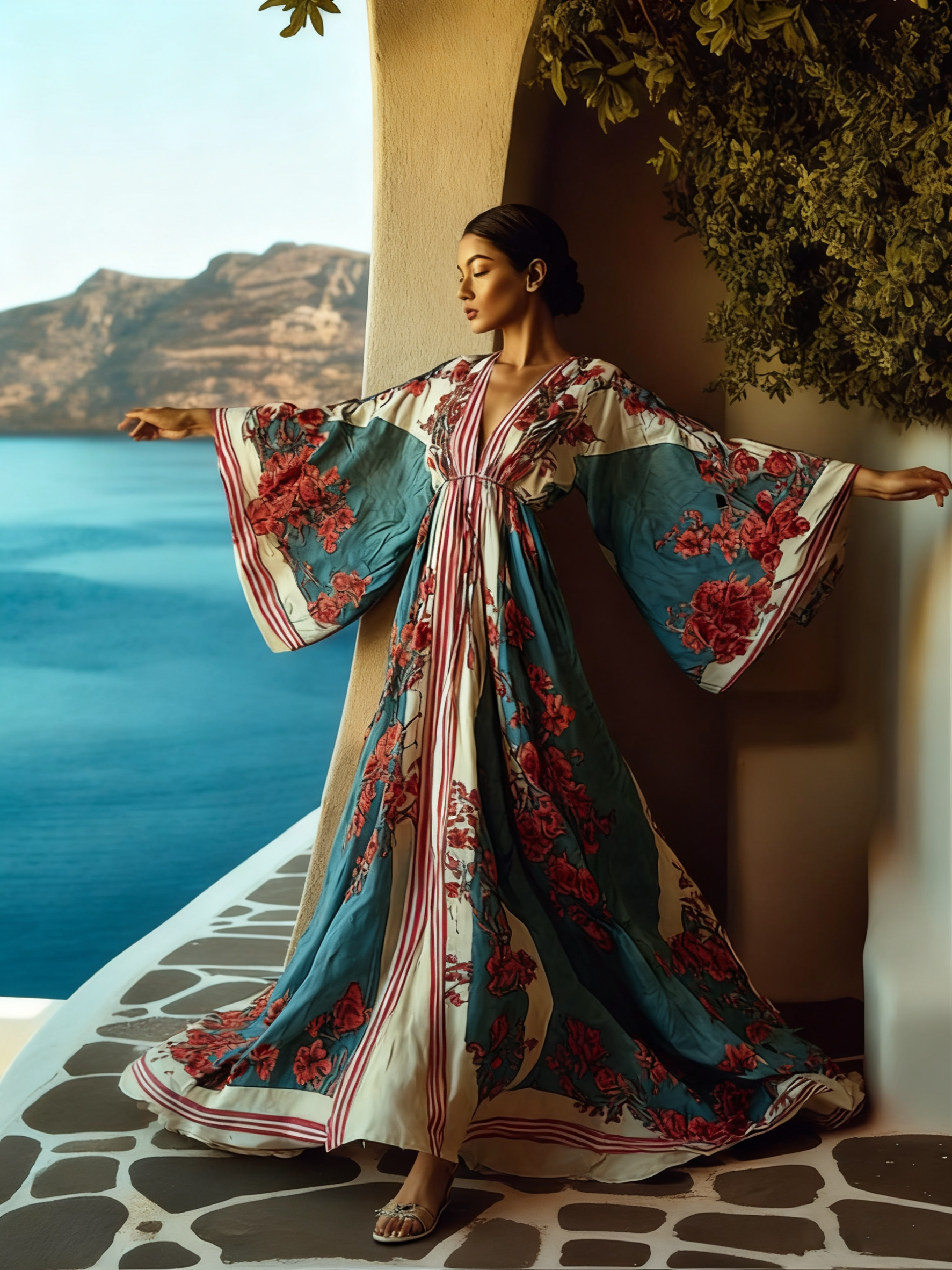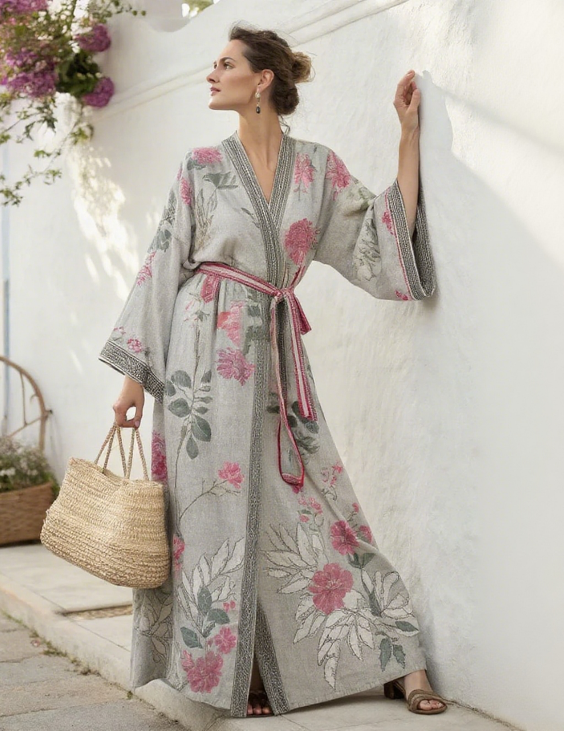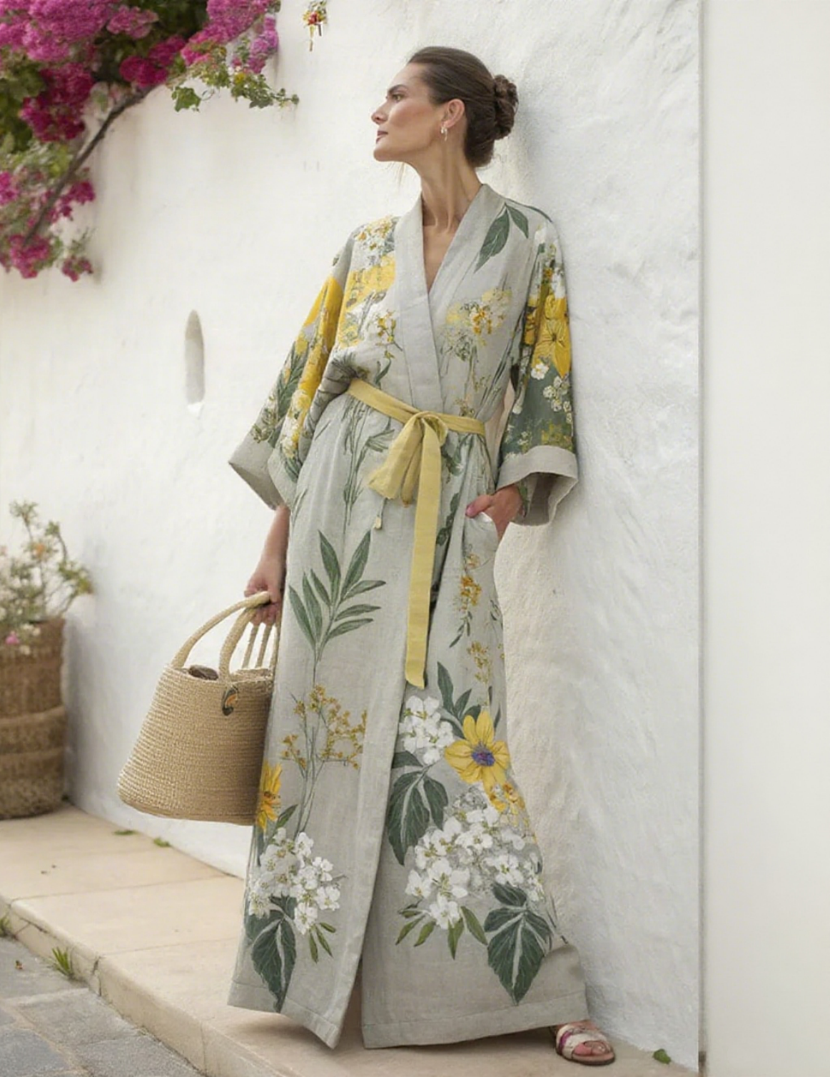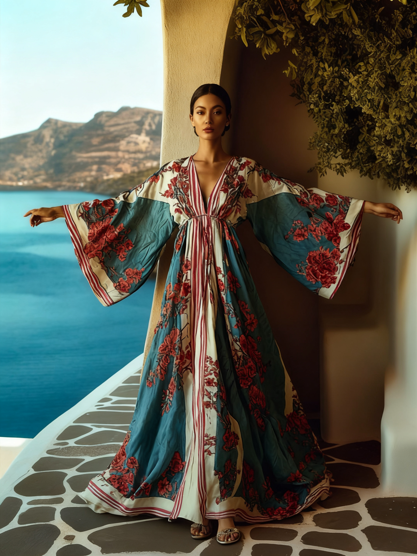 Artistic floral seaside resort pattern kimono robe (with belt)$37.04 USD -