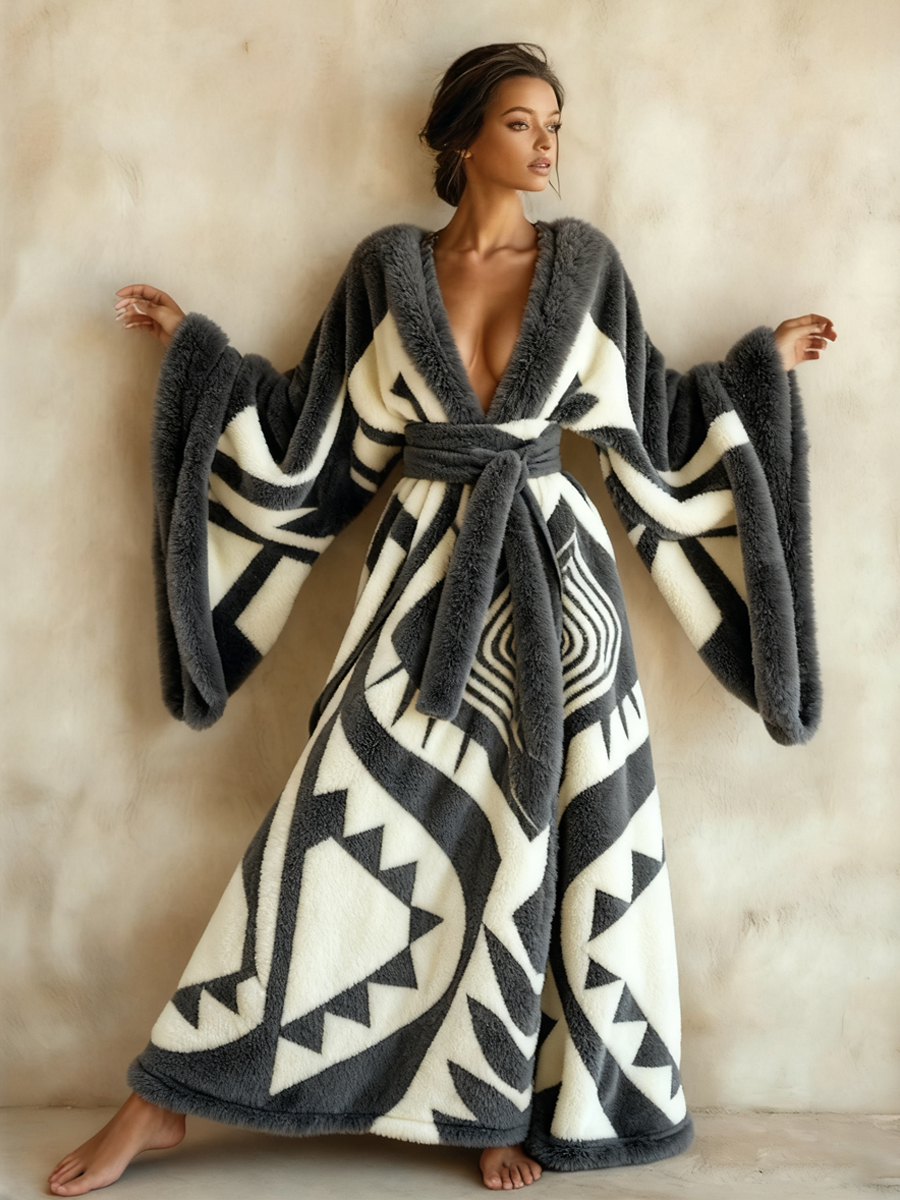 Abstract Art Print Kimono Long Gown Autumn and Winter Robe With Belt$61.74 USD