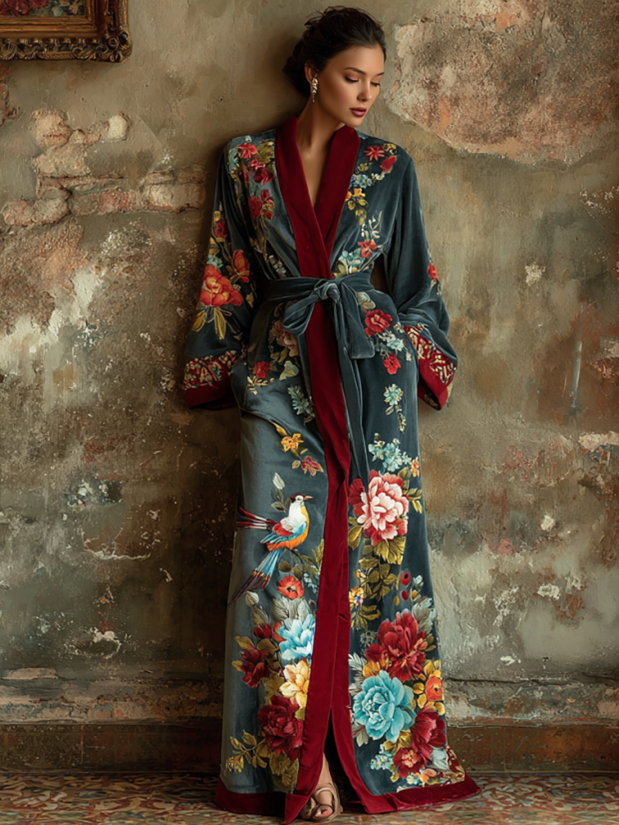 Artistic floral print kimono robe, autumn/winter long robe with sash.$61.74 USD -