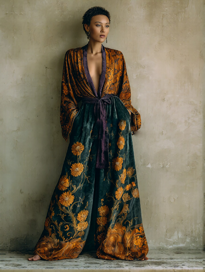 Artistic print V-neck loose-fitting fluffy long robe for autumn and winter$67.44 USD -