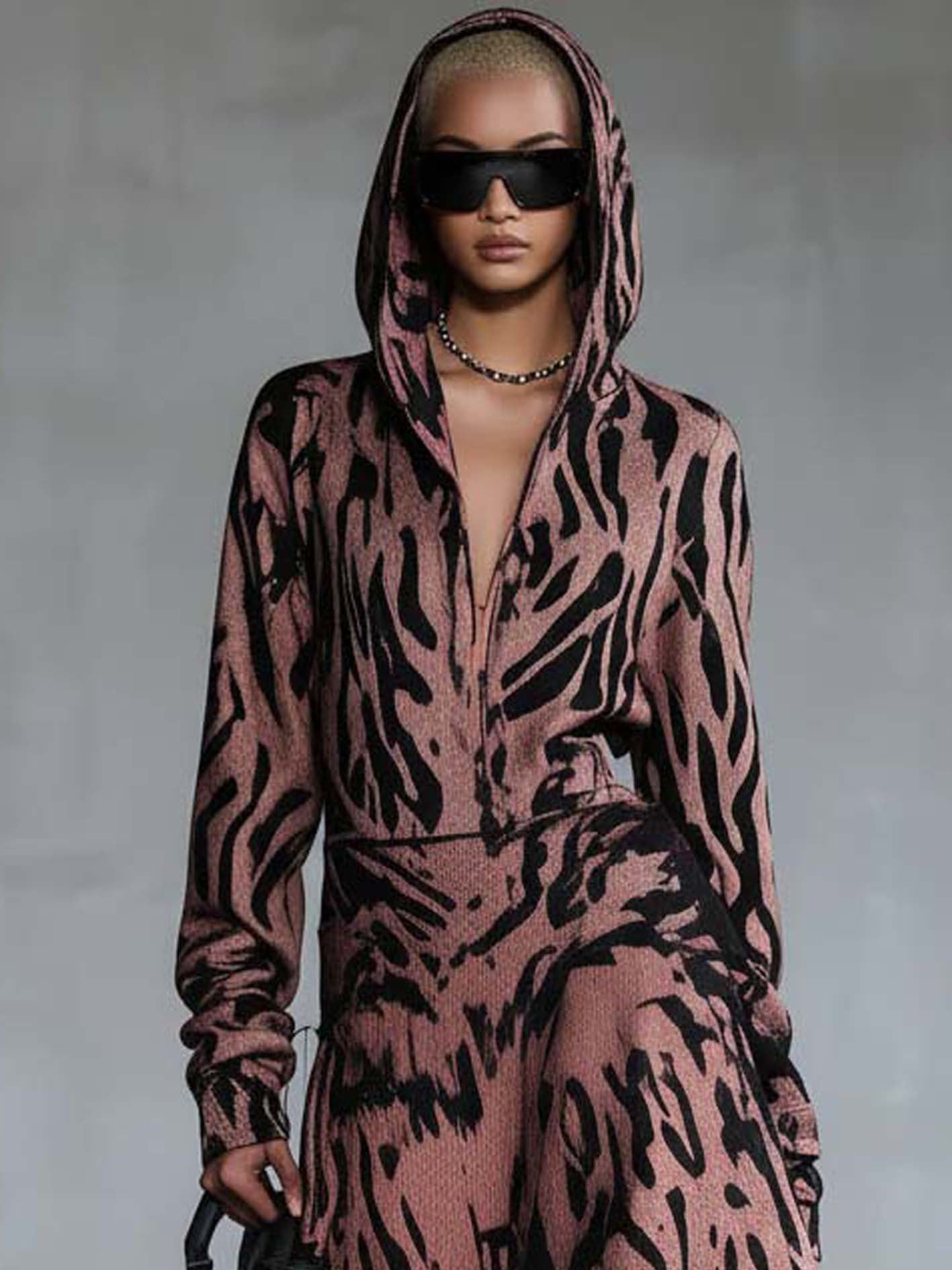 Pink Hooded Sweatshirt Midi Dress With Ruffles And Print$39.98 USD -