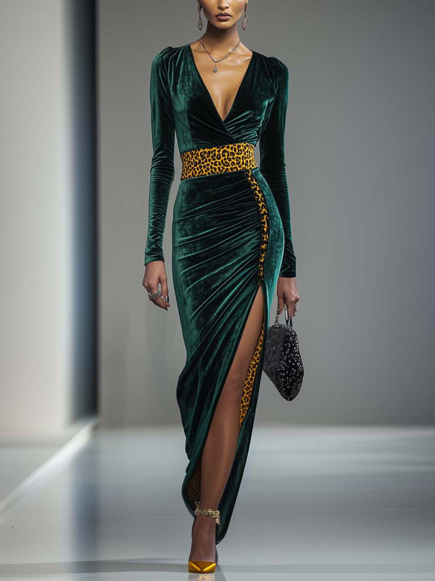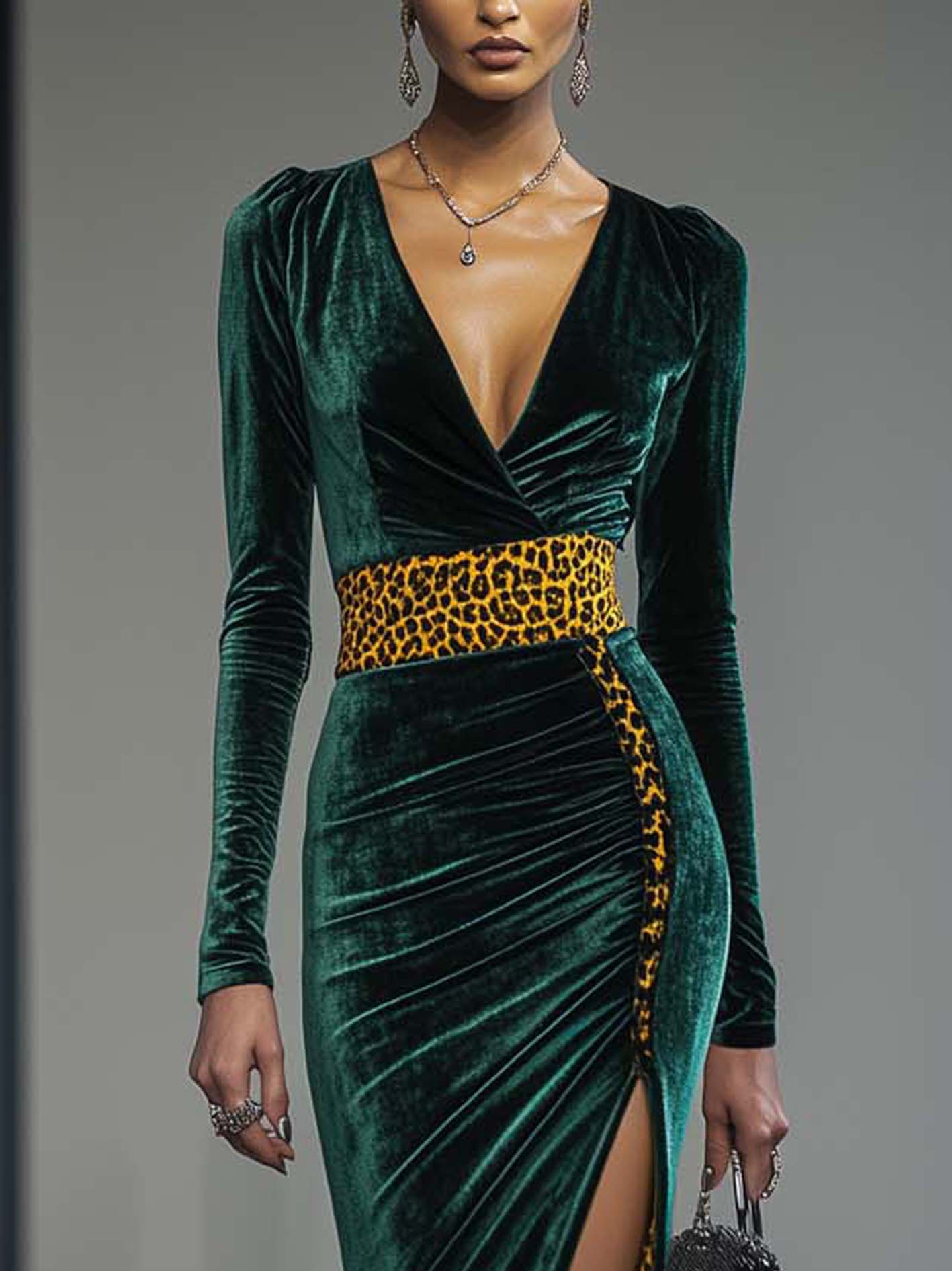 Dark Green Velvet Front Slit Bodycon Dress With Yellow Leopard Print$39.98 USD -