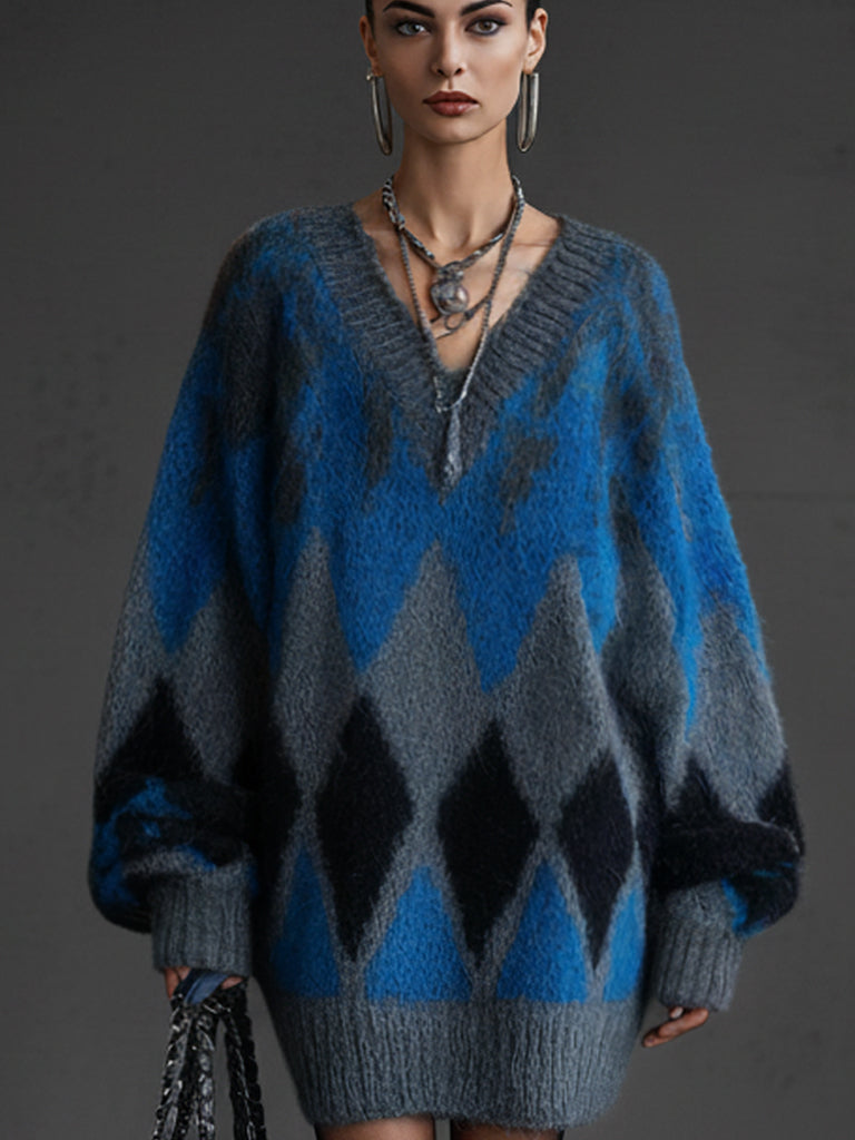 Blue Argyle Knit Oversized Sweater Skater Dress$39.98 USD -