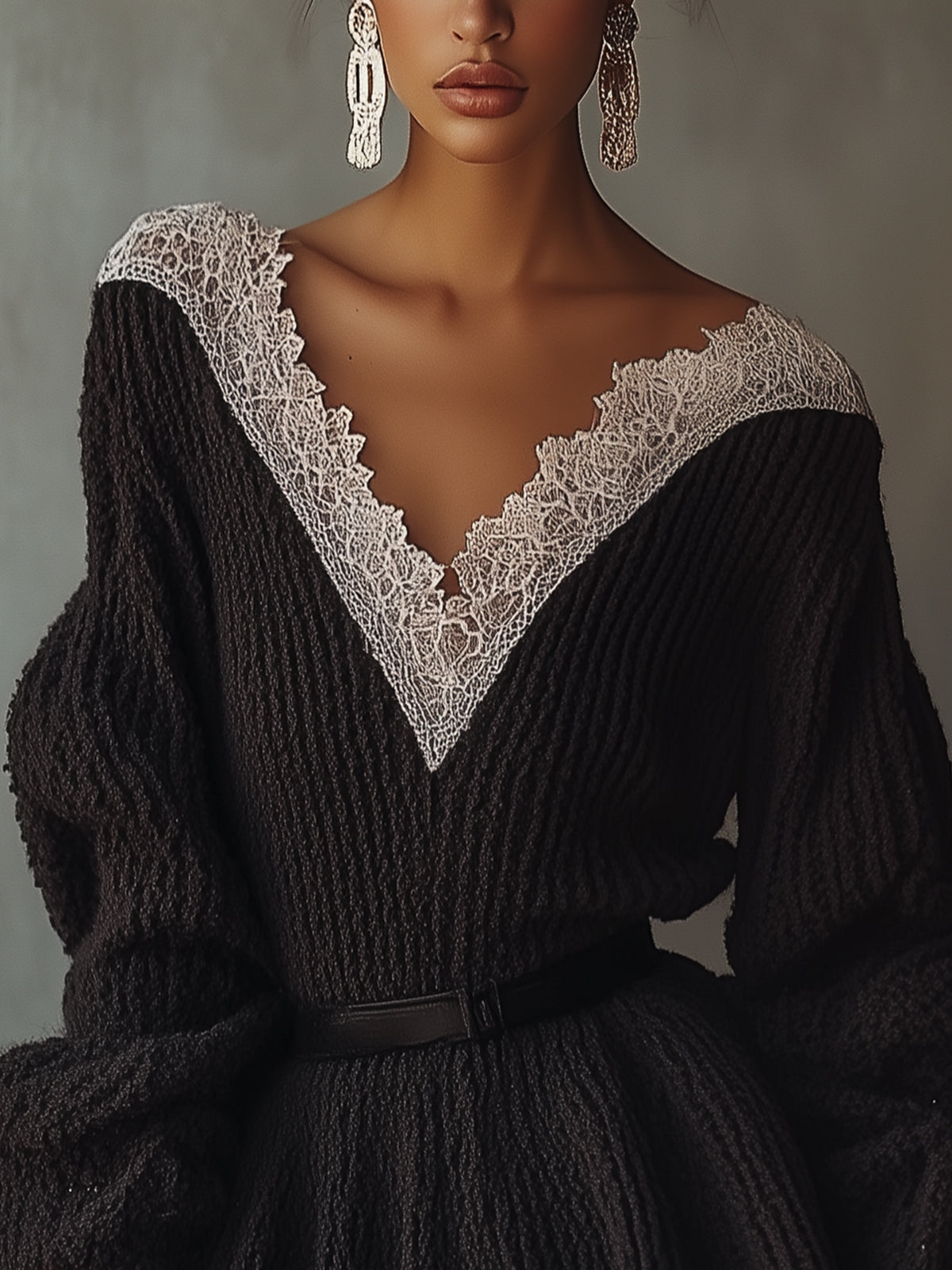 Black Knitted Mini Dress With Lace V-neck And Hem And Belt$39.98 USD -