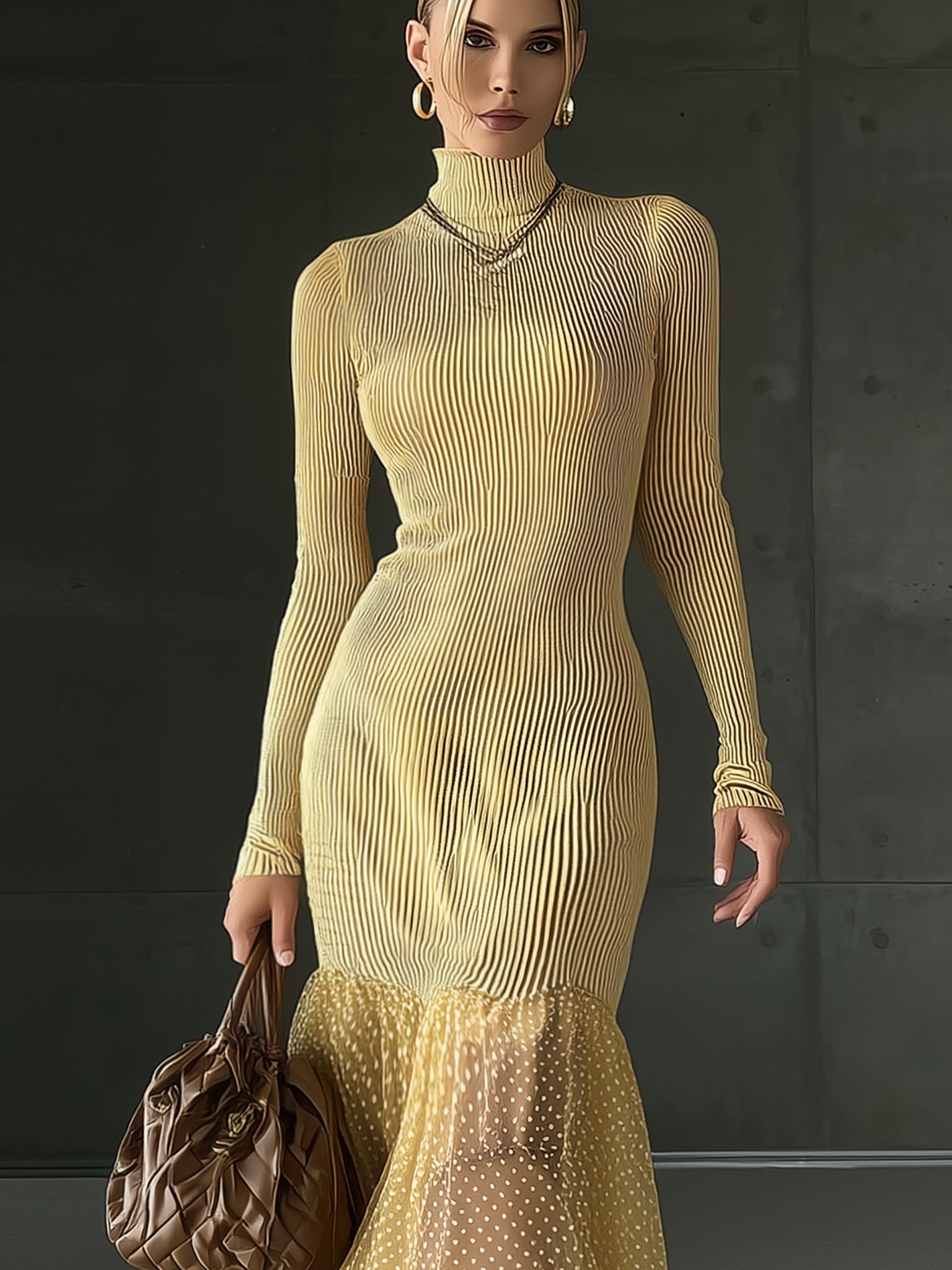 Yellow Knitted Patchwork Chiffon Polka Dot Maxi Dress$39.98 USD -