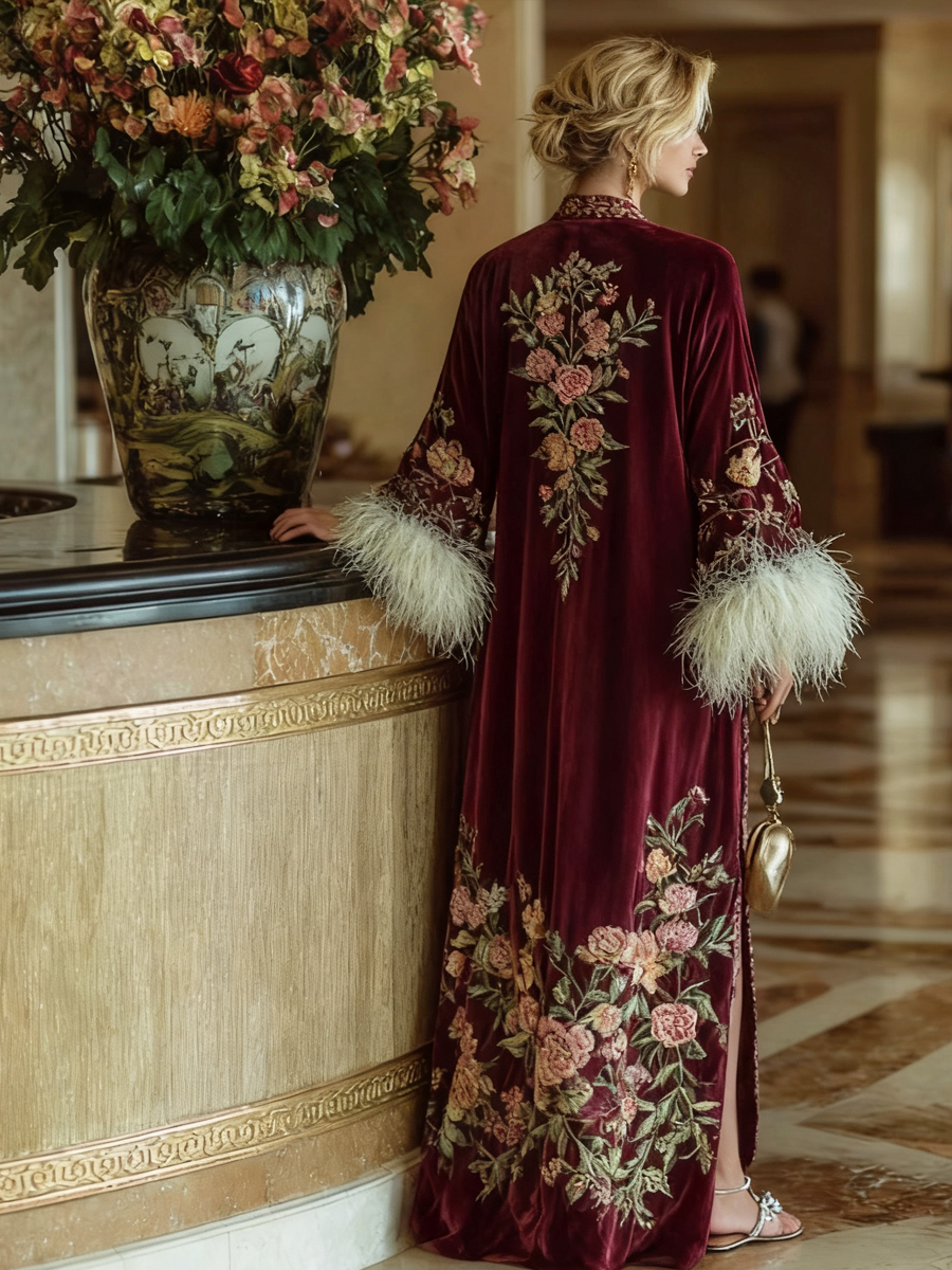 Embrace timeless elegance in our Velvet Couture Robe, crafted from sumptuous velvet that drapes like liquid luxury. This figure-flattering masterpiece features a belted waist that accentuates your silhouette while maintaining graceful comfort. Delicate floral embroidery cascades from the neckline, echoing vintage glamour with modern sophistication. The floor-length design flows with regal grandeur, perfect for special occasions or luxurious lounging. Includes a matching self-fabric belt that defines the waist beautifully. Experience aristocratic comfort and refined style in this heirloom-quality piece designed for discerning women who appreciate life's finest pleasures.