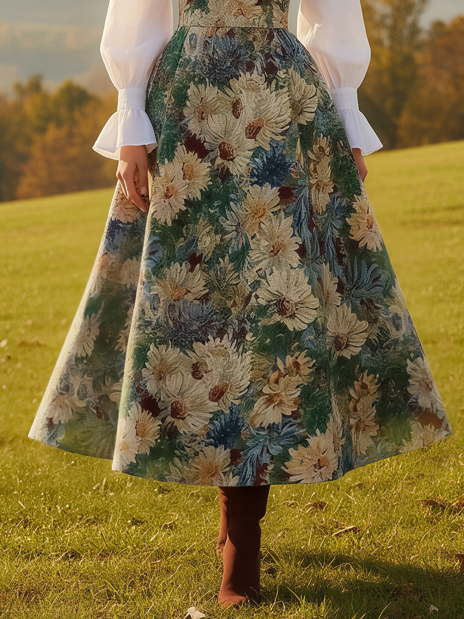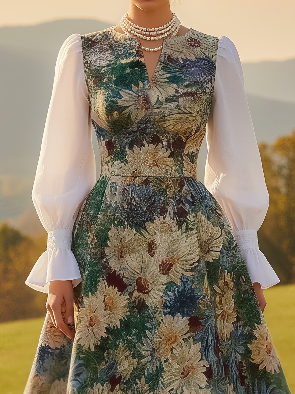 Midi Linen Dress, Long Sleeves, V Neck, Floral, Vintage, Cyan