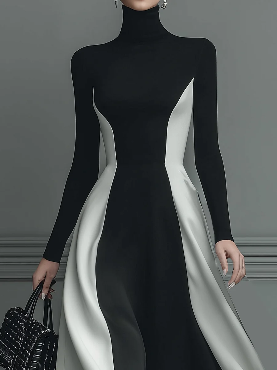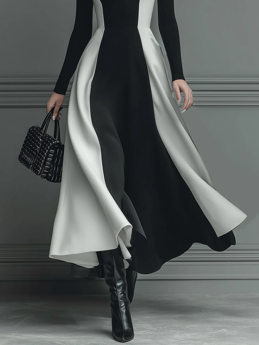 A striking black and white knitted maxi dress with bold stitching, featuring a fluid silhouette for elegant movement.