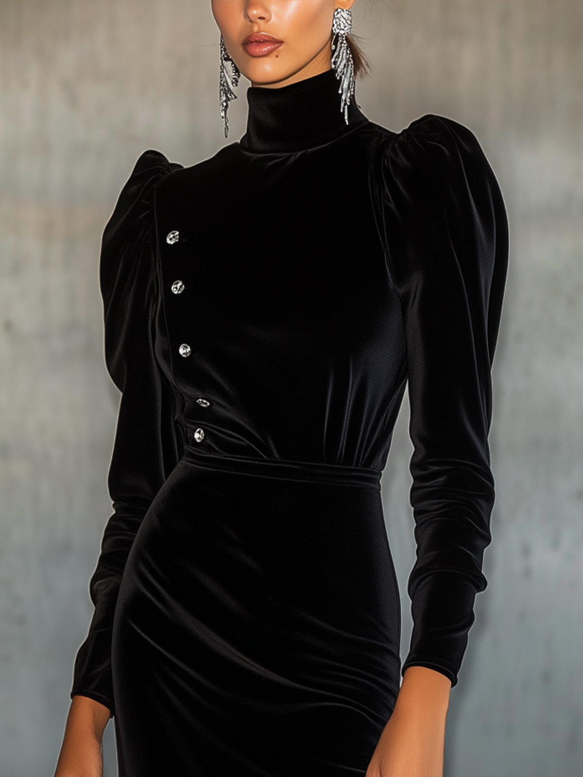 This dress embodies sophistication with a touch of drama. The plush velvet ensures a plush appearance, while the asymmetrical button detailing adds a contemporary twist. It's both elegant and versatile, ideal for making a striking impression.