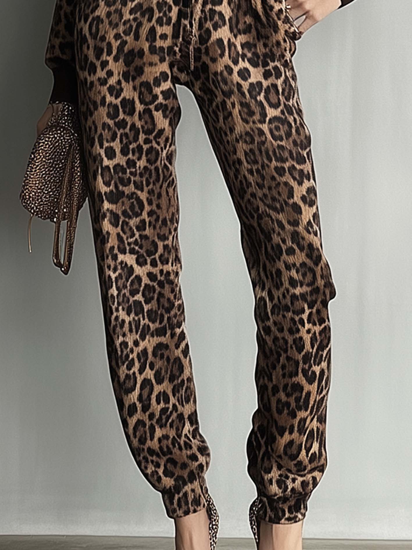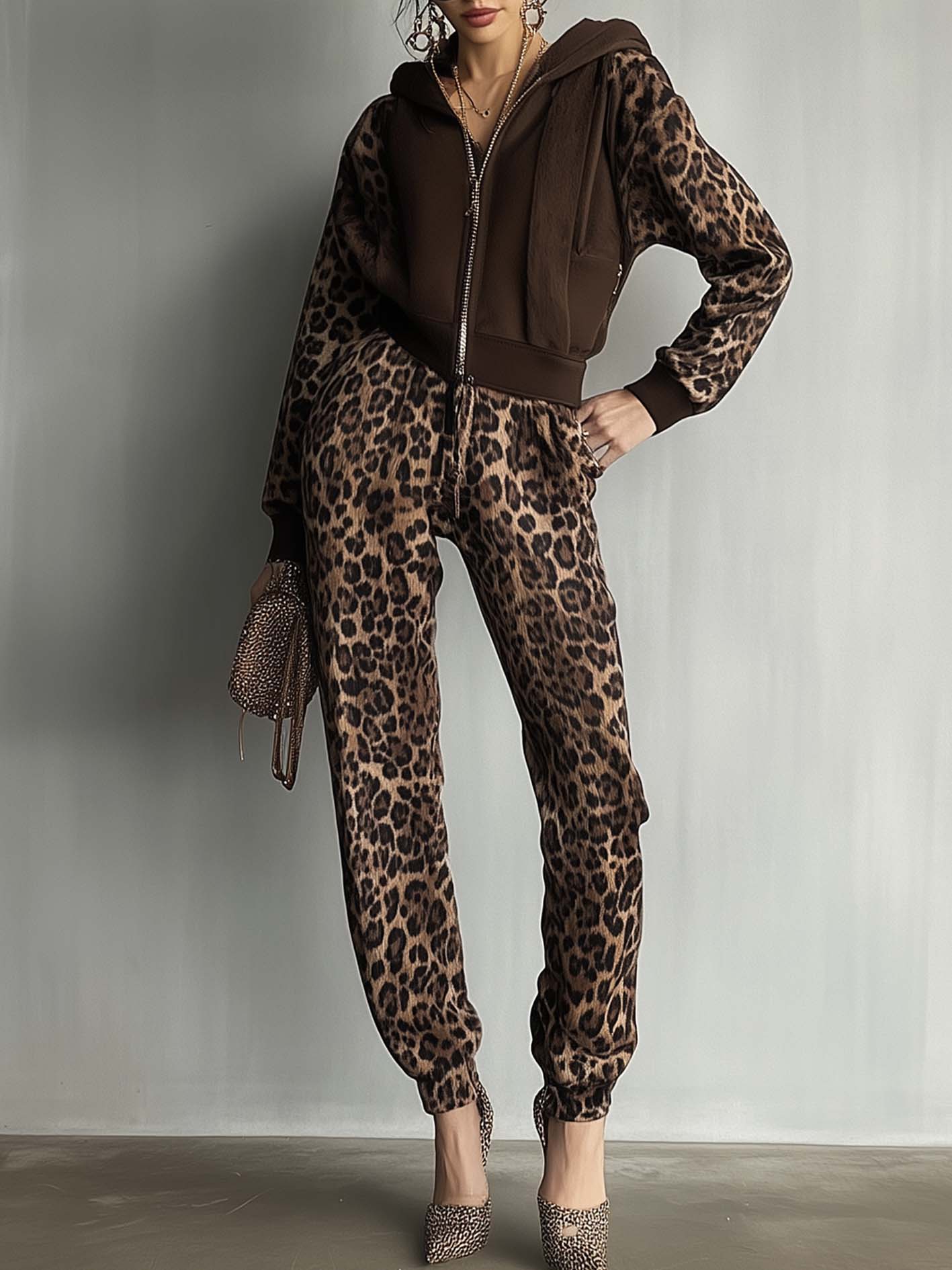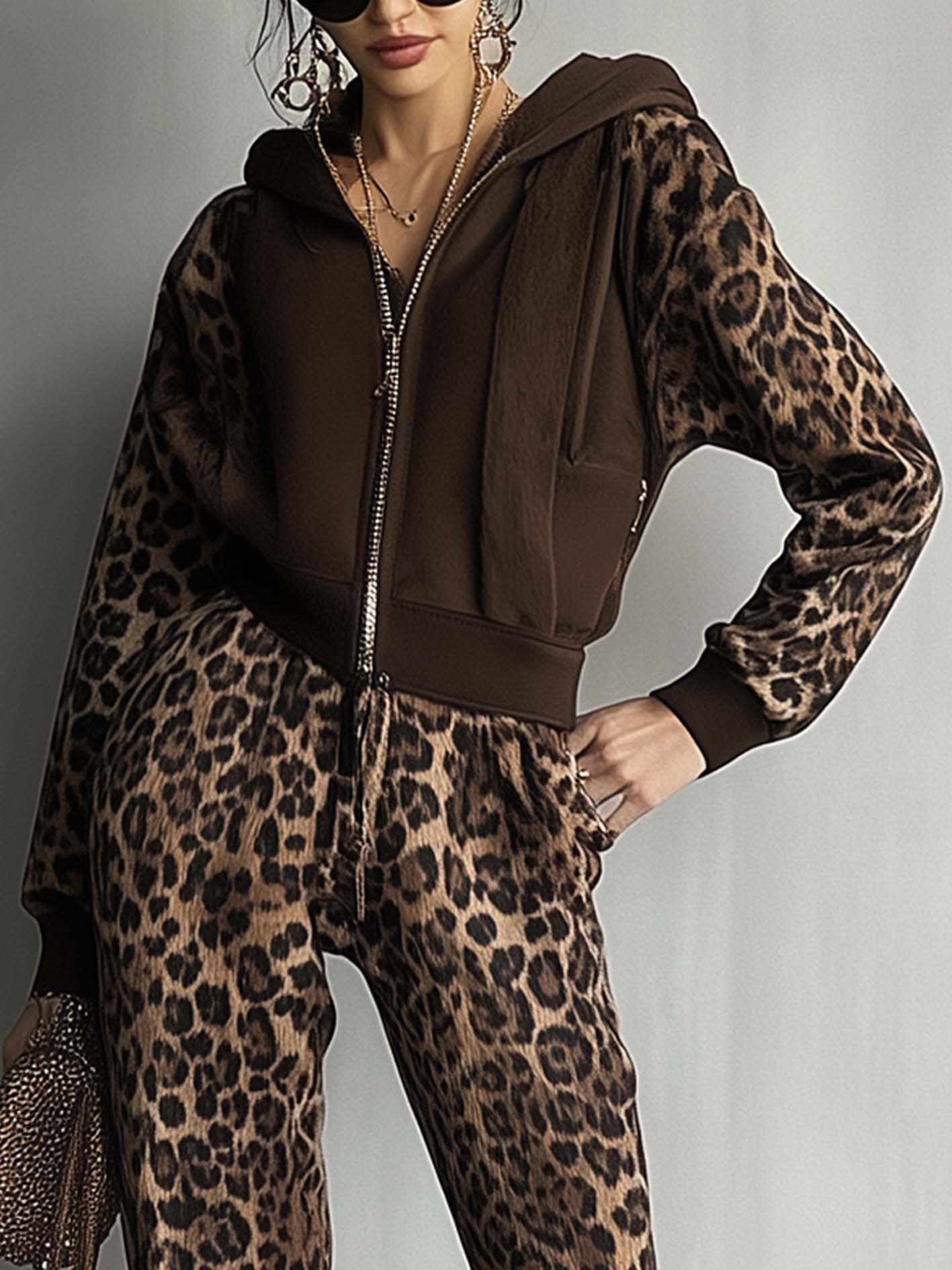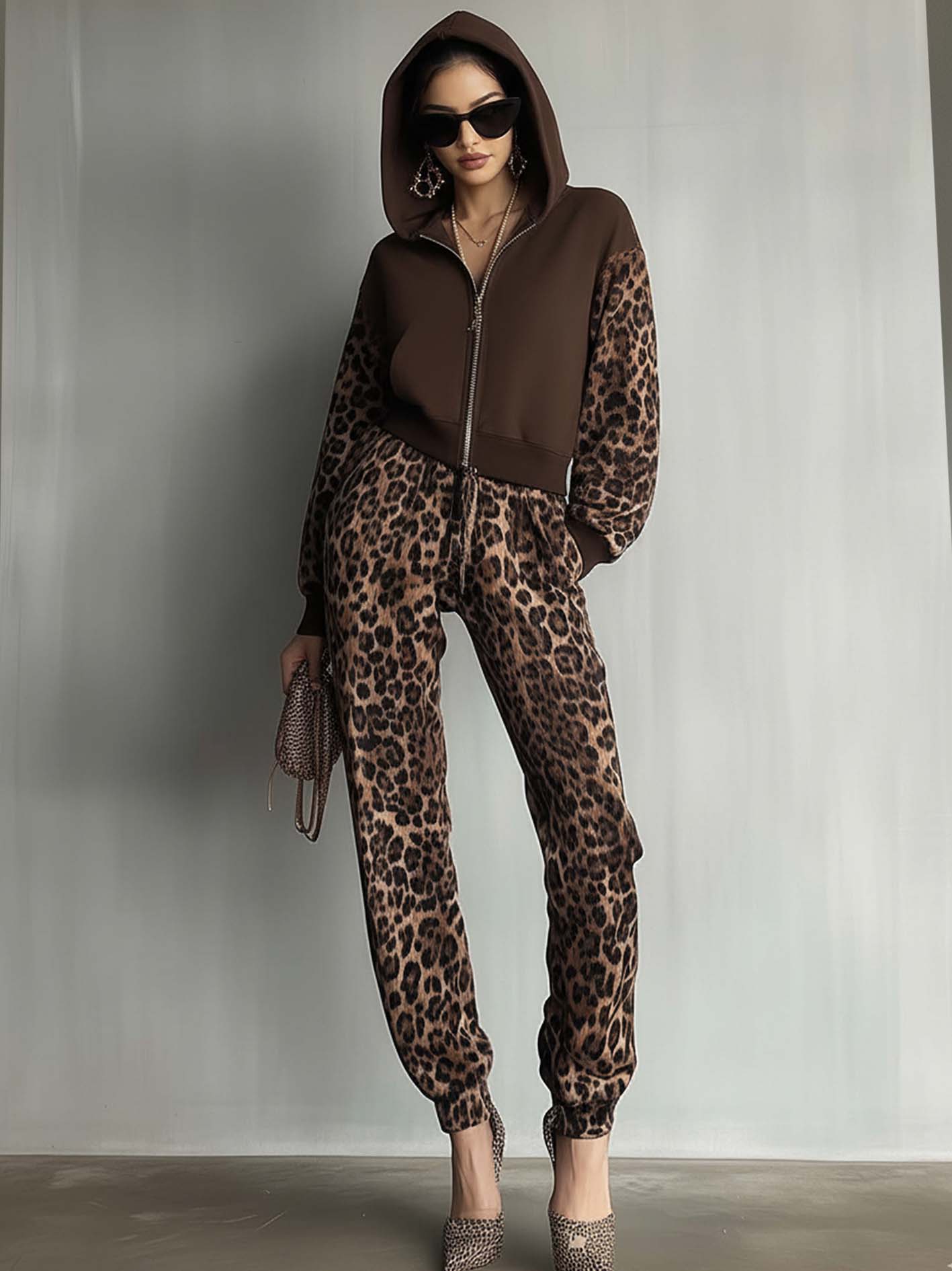 2. Design: A hoodie-style jumpsuit in deep brown with contrasting leopard print sleeves and pants for a bold, urban look.