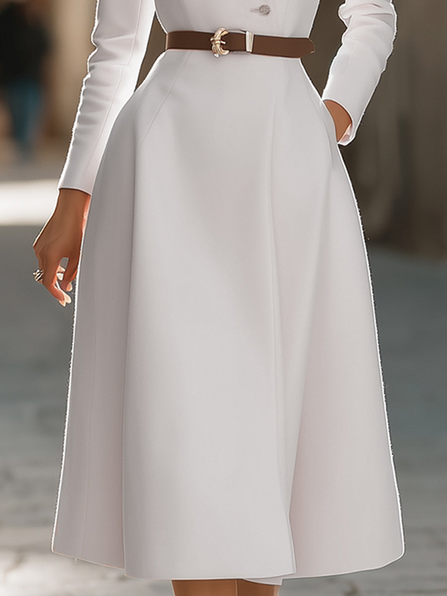 This white belted blazer midi dress embodies timeless elegance with a contemporary twist. The tailored blazer-inspired bodice features a sharp lapel collar and a two-button closure that cinches the waist, highlighted further by a contrasting brown belt with a polished buckle detail. The dress flows into a flared A-line skirt, creating graceful movement with every step.