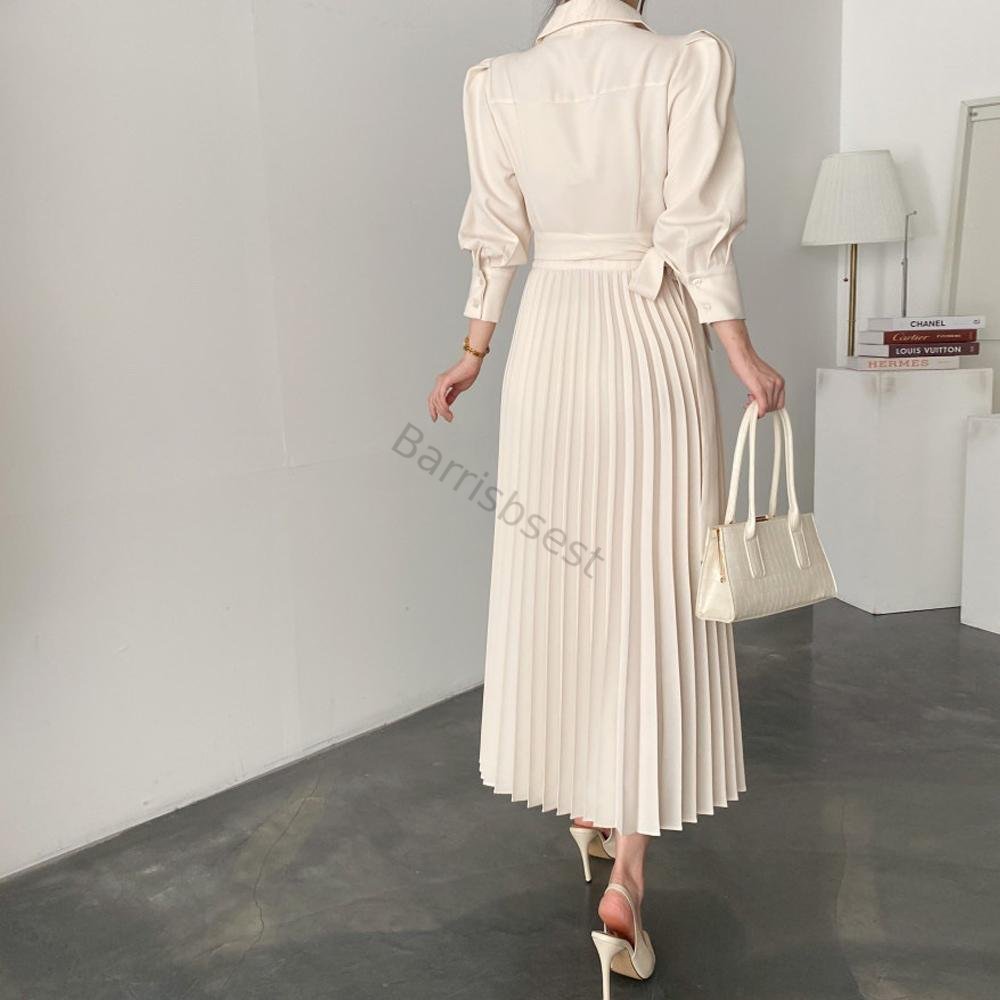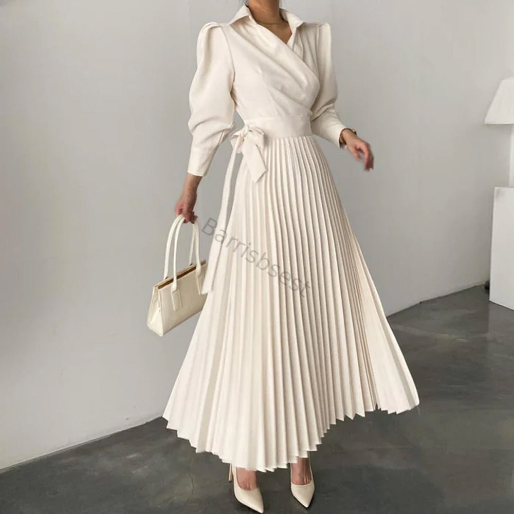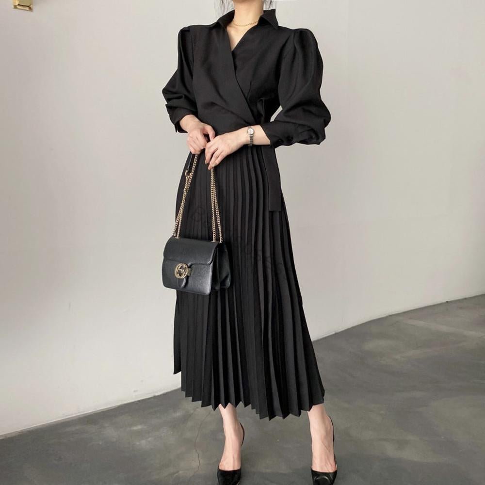 Color: Solid Style: Elegant Pattern Type: Plain Details: Wrap, Pleated, Tie Front Type: Dress Neckline: Collar Sleeve Length: Long Sleeve Sleeve Type: Bishop Sleeve Waist Line: High Waist Hem Shaped: Pleated Length: Long Fit Type: Regular Fit Fabric: Non-Stretch Material: Polyester Care Instructions: Machine wash or professional dry clean