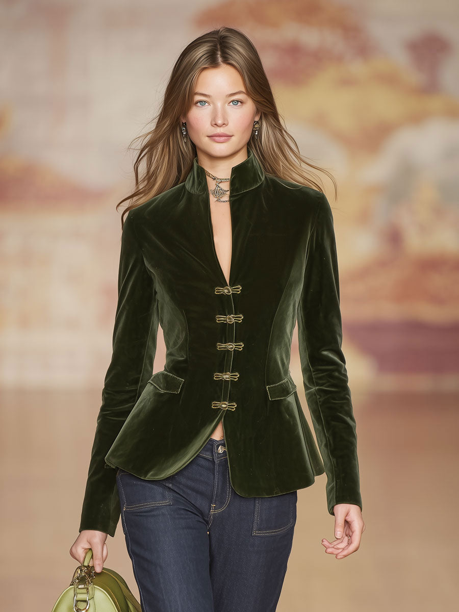 The Elegant Retro Gold-Buttoned Dark Green Velvet Blazer is a standout piece that combines classic sophistication with a touch of vintage flair. Made from luxurious dark green velvet, this blazer offers a rich texture and a deep, captivating hue that exudes elegance. The choice of dark green is both timeless and versatile, making it an excellent addition to any wardrobe for those seeking a statement piece that can transition seamlessly from day to night.