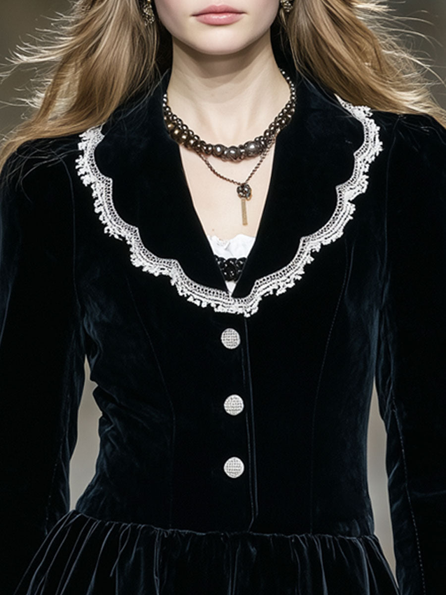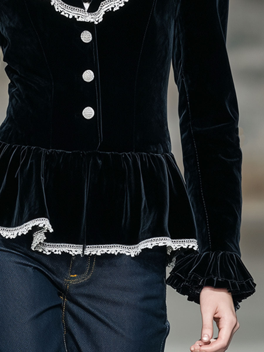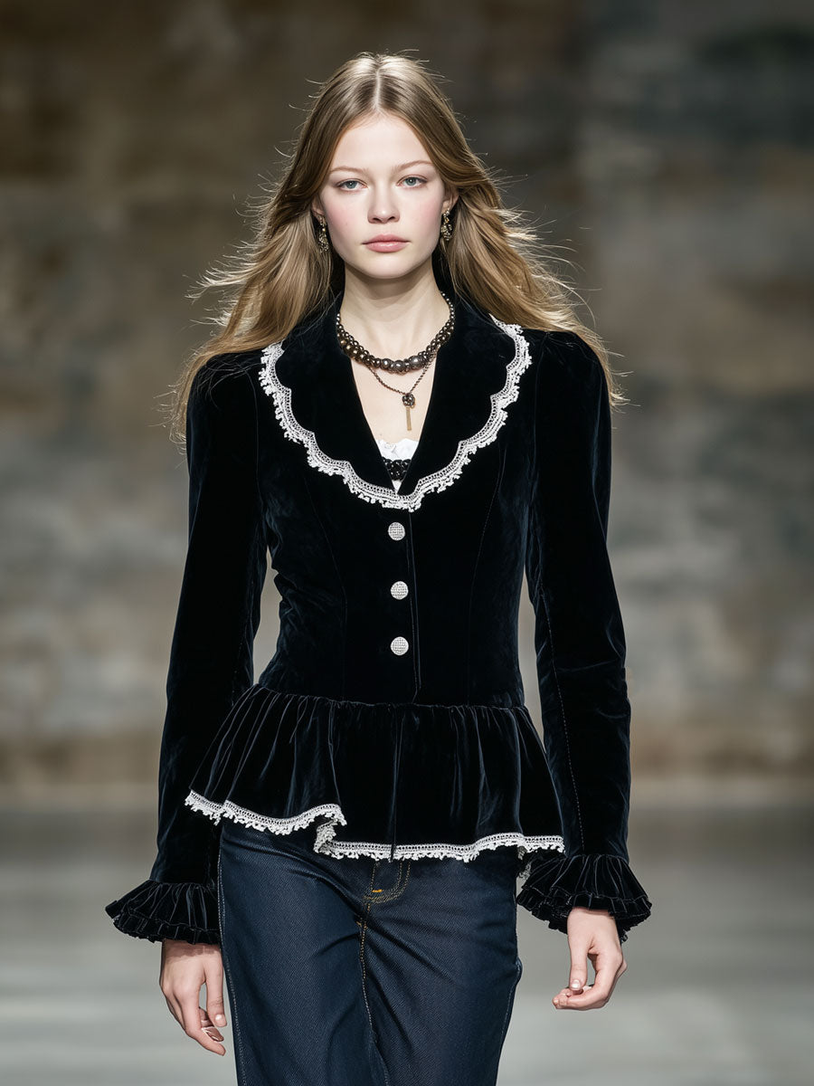 The Elegant Retro Lace-Trimmed Black Velvet Ruffled Blazer is a striking piece that beautifully marries classic elegance with romantic details. Crafted from sumptuous black velvet, this blazer offers a rich, tactile experience and a timeless color that serves as a versatile foundation for any sophisticated wardrobe. The deep black hue of the velvet provides a luxurious backdrop that highlights the intricate details of the blazer, making it suitable for both formal occasions and stylish evening outings.
