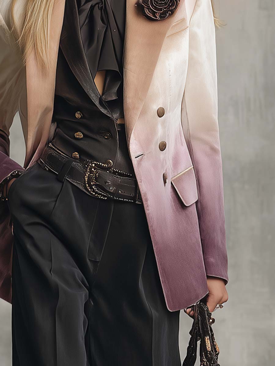 Introducing the Elegant Retro Western Peak Lapel 3D Flower Decoration Beige And Purple Gradient Velvet Blazer, a stunning fusion of timeless elegance and modern design. This blazer stands out with its unique beige and purple gradient velvet fabric, offering a luxurious and sophisticated look. The 3D flower decoration adds a touch of whimsy and artistry, making it an eye-catching piece for any wardrobe.