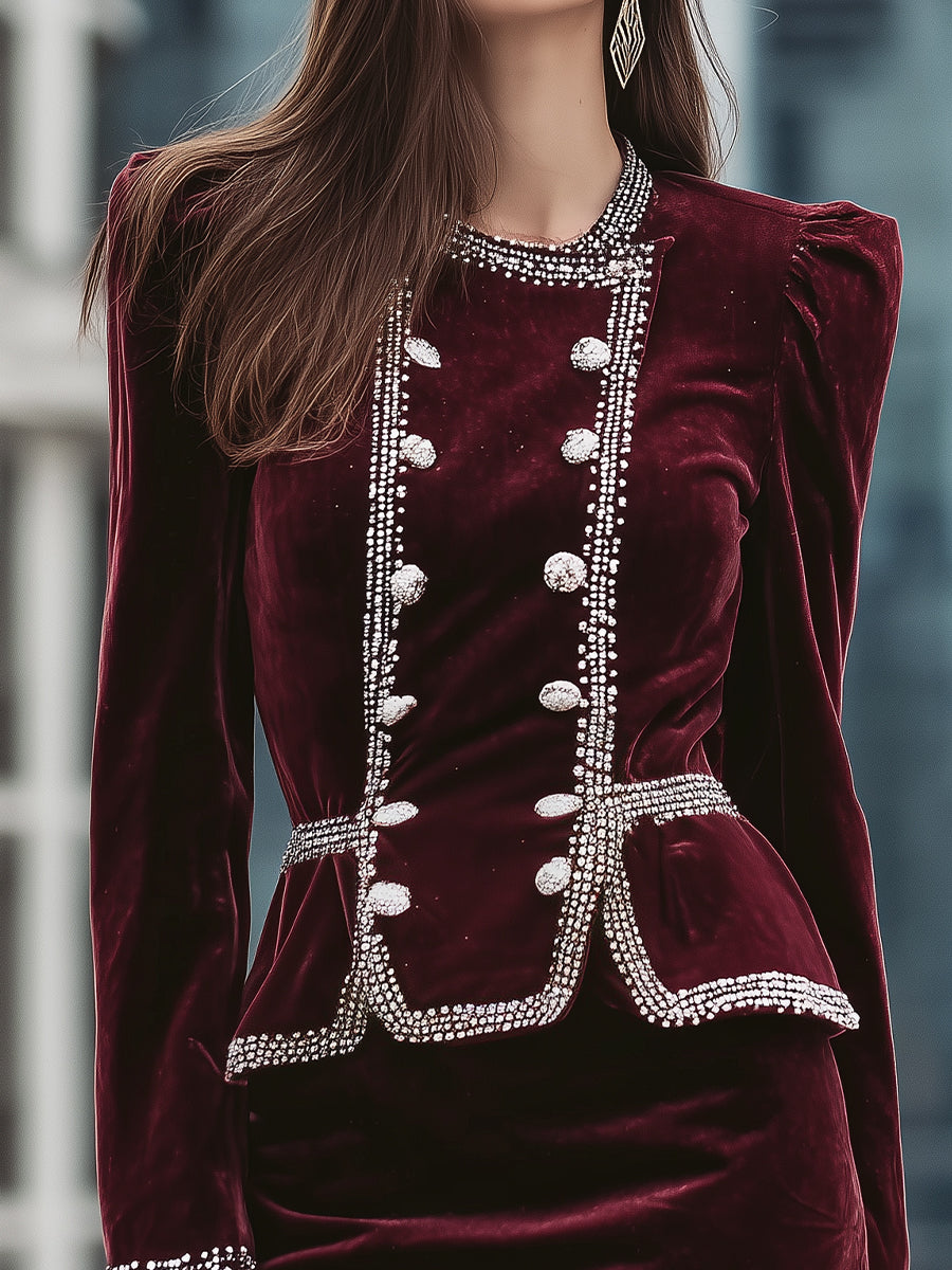 Embody luxurious elegance with this stunning burgundy velvet jacket and skirt set. The chic jacket is adorned with shimmering rhinestone buttons and intricate crystal detailing along the collar, cuffs, and waist, creating an exquisite look that stands out at any event.